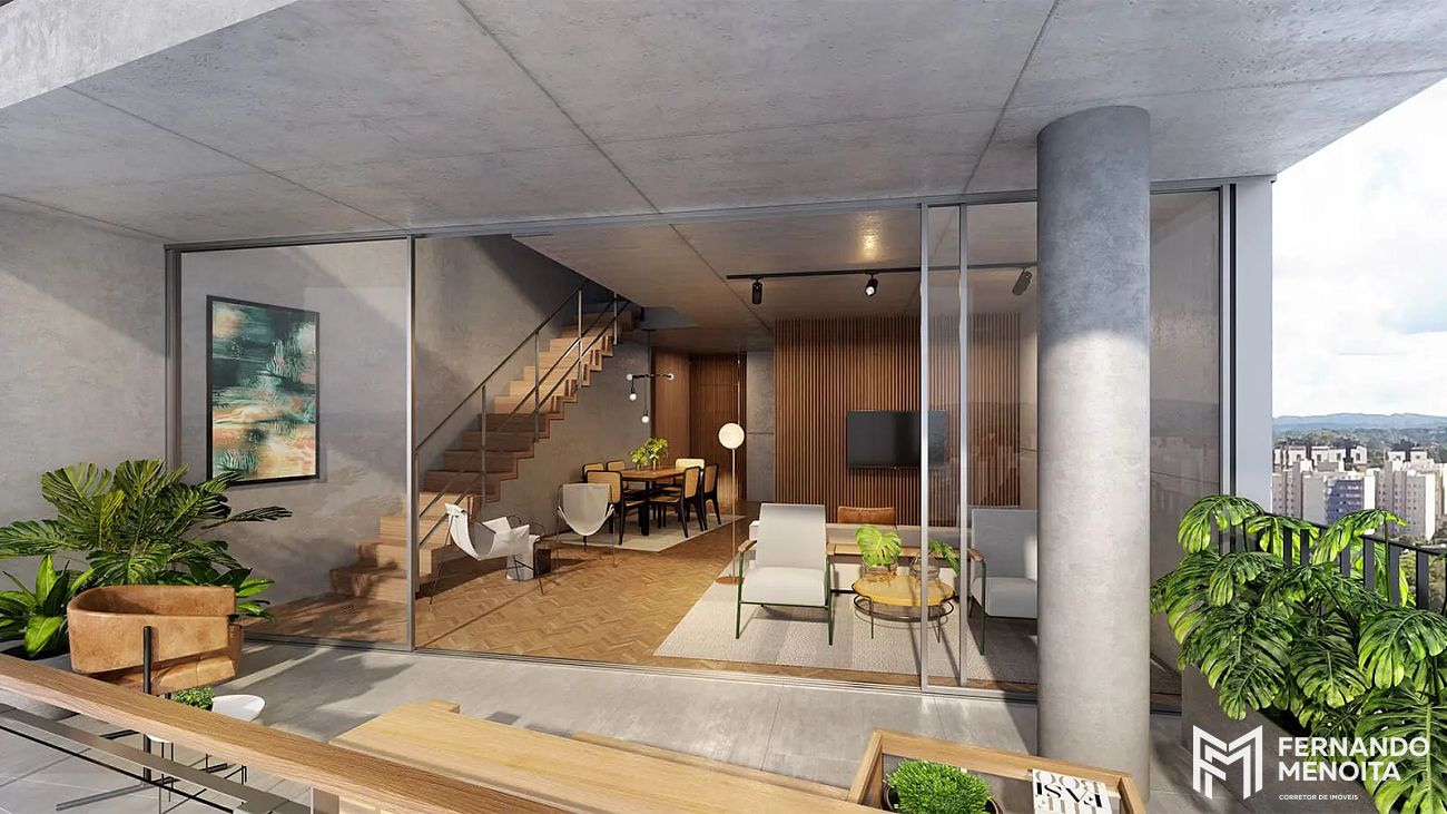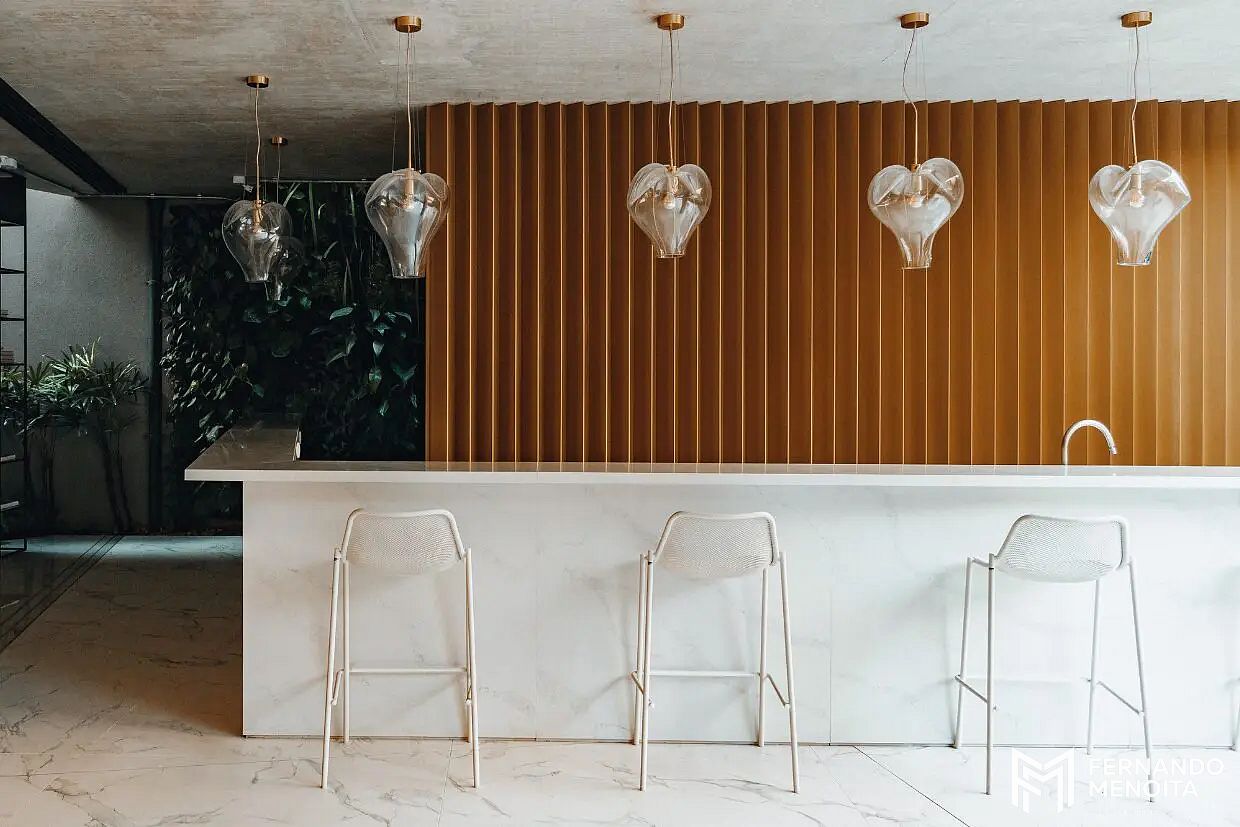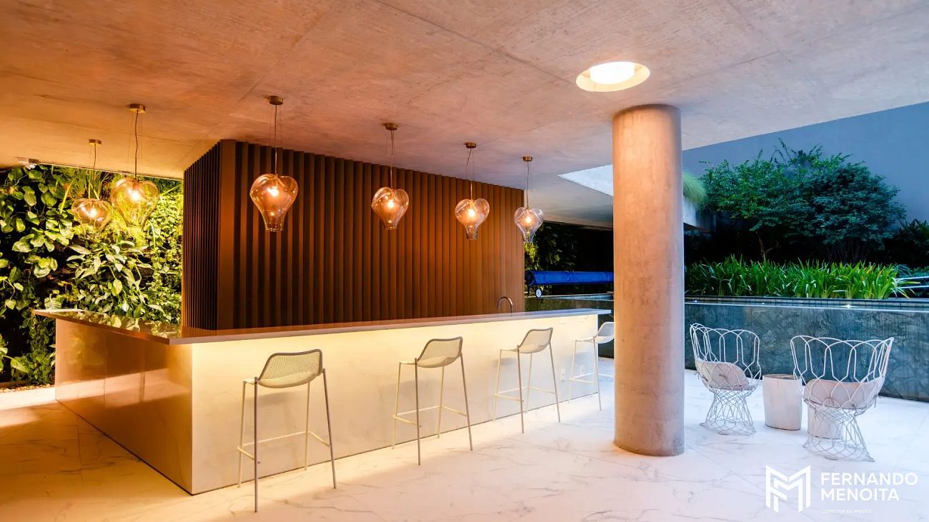 Os acabamentos elevam o padrão do empreendimento, com uso de mármore Paraná, concreto aparente tratado, quartzito Botanic Green e pedra vulcânica Ijal, criando uma estética contemporânea e sofisticada.