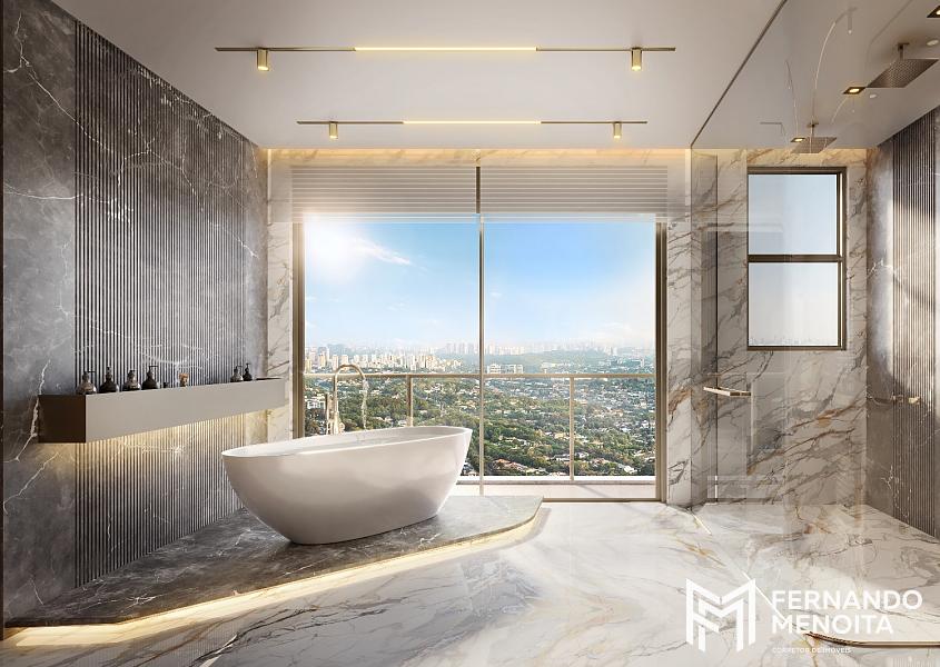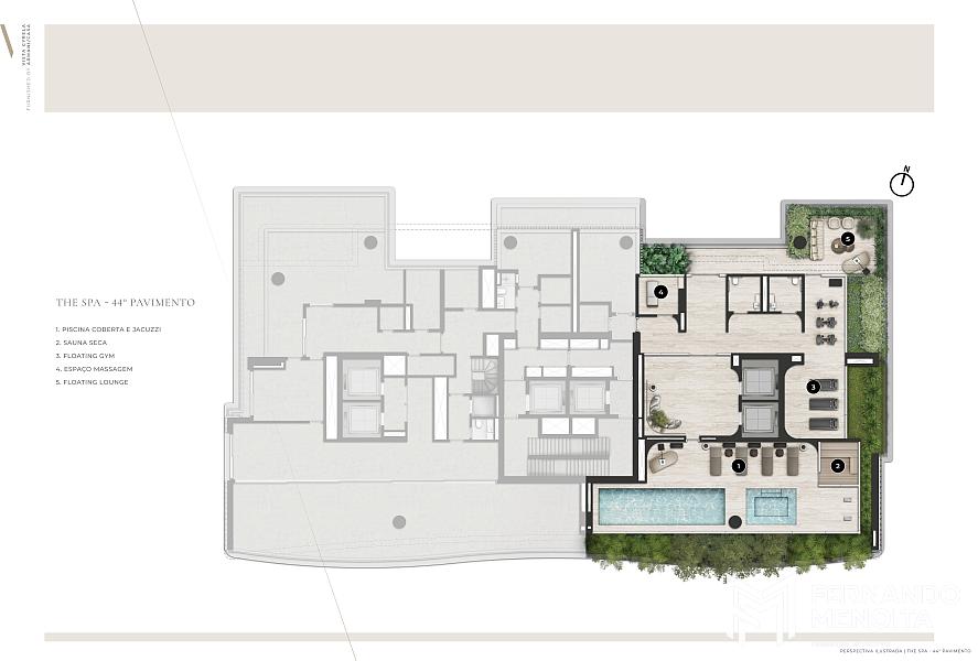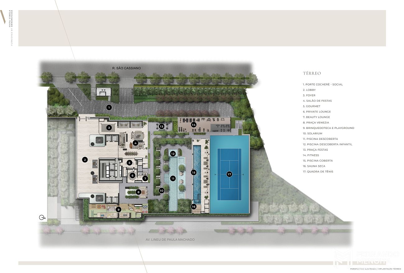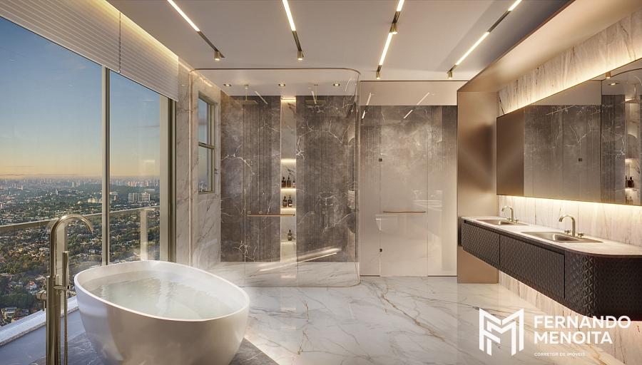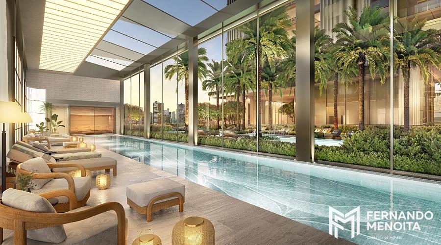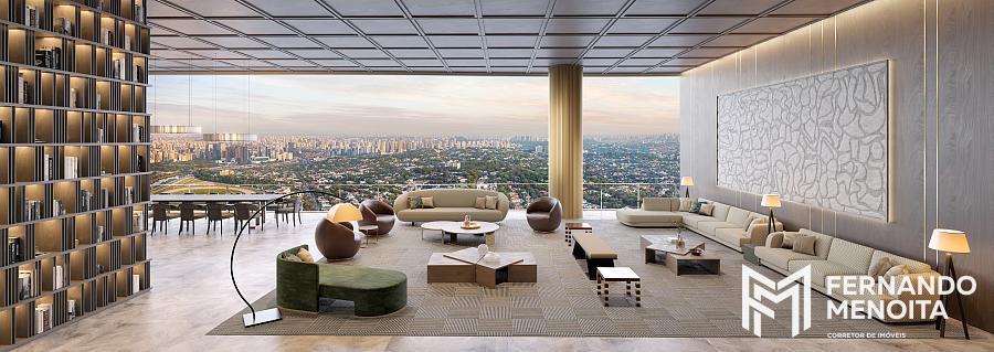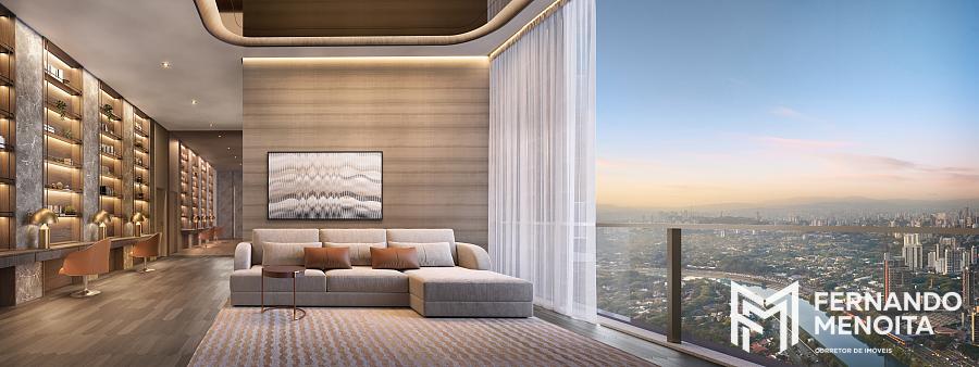 A área de lazer do empreendimento inclui ambientes distribuídos no térreo, como salão de festas, gourmet, private lounge, beauty lounge, brinquedoteca e playground, fitness, piscinas e quadra de tênis, além do exclusivo The Spa no 44º pavimento, com piscina coberta e jacuzzi, sauna seca, floating gym, espaço massagem e floating lounge.