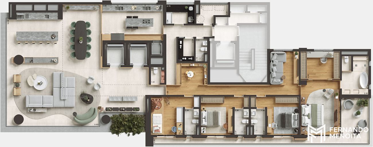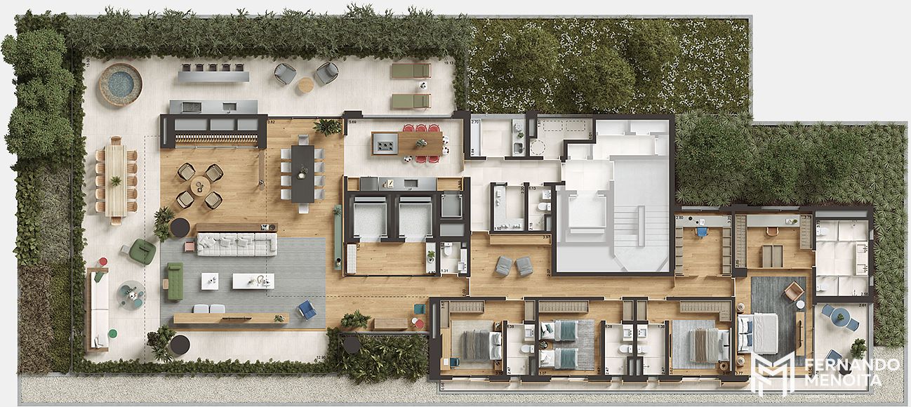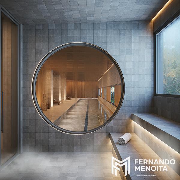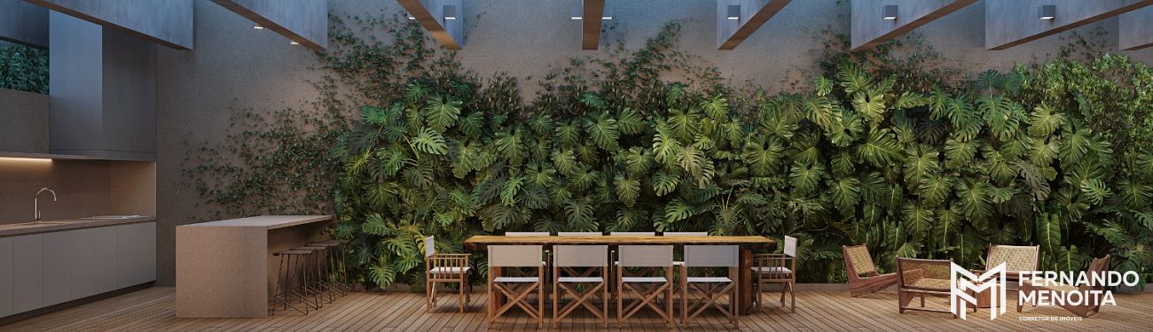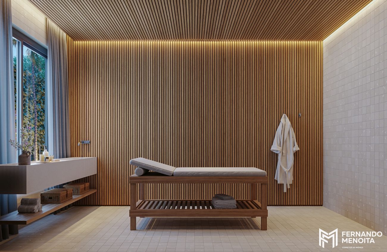 O projeto de interiores, assinado pelo escritório NJ+ Arquitetos, aliado ao paisagismo do Soma Arquitetos, cria uma atmosfera sofisticada e acolhedora, com integração entre natureza, materiais nobres e iluminação natural. O hall social, inspirado na arquitetura paulistana das décadas de 50 e 60, traz um jardim interno com espelho d’água e abertura zenital, elevando a experiência de chegada a um novo patamar.