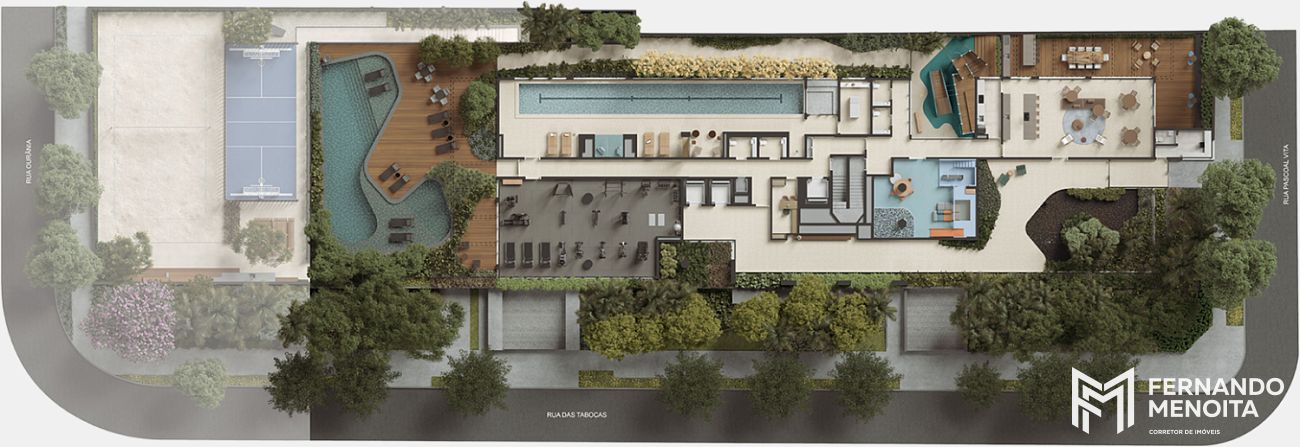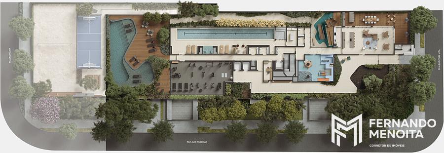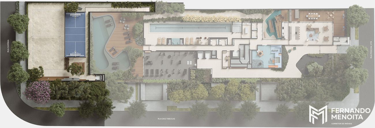 A área de lazer foi pensada para atender diferentes momentos da vida contemporânea, com estrutura completa que inclui piscina coberta climatizada com raia de 25 metros, piscina descoberta climatizada com solarium, quadra de areia com medidas oficiais para beach tennis, quadra esportiva para pickleball, academia com terraço, sauna úmida, sala de massagem, brinquedoteca, playground, espaço pet, salão de festas com espaço gourmet e terraço com churrasqueira, sala de reunião e praça de convivência.