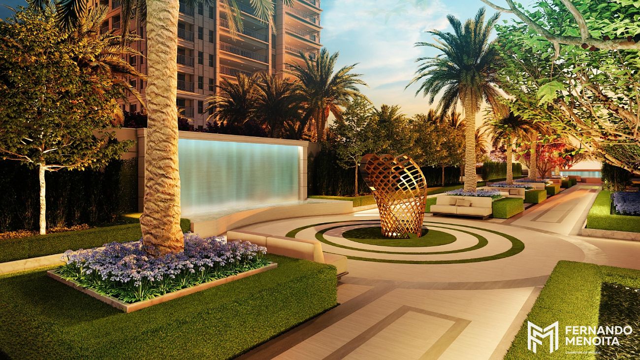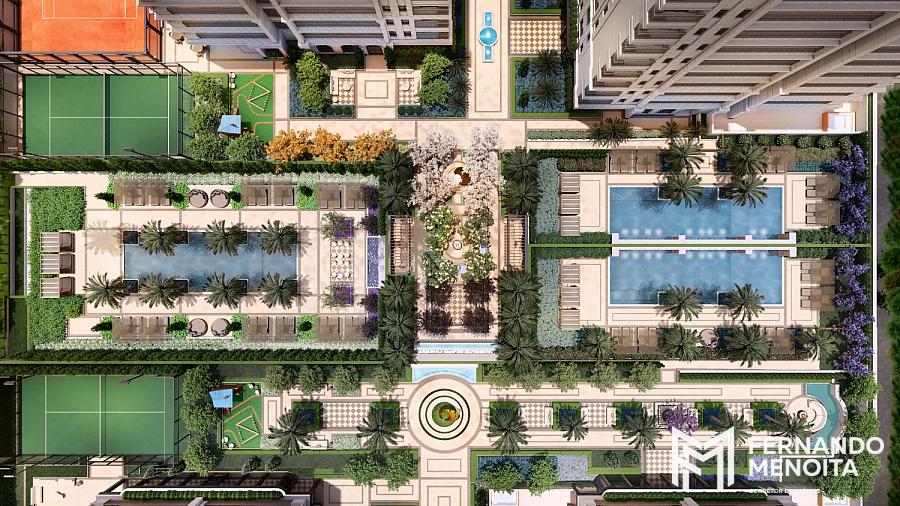 A arquitetura segue uma linguagem clássica reinterpretada com leveza contemporânea, valorizando simetria, proporção e materiais nobres, enquanto o paisagismo assinado pela EDSA cria uma experiência sensorial com praças e alamedas que desaceleram o tempo e elevam o cotidiano.