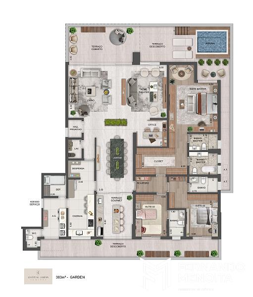 O Lumière apresenta uma proposta residencial de alto padrão com 58 unidades, distribuídas em plantas amplas e bem resolvidas, incluindo apartamentos tipo de 355 m², gardens de 383 m² e coberturas duplex de 700 m², todas com generosa distribuição de espaços e integração com áreas externas.