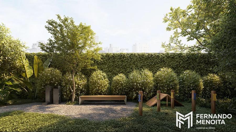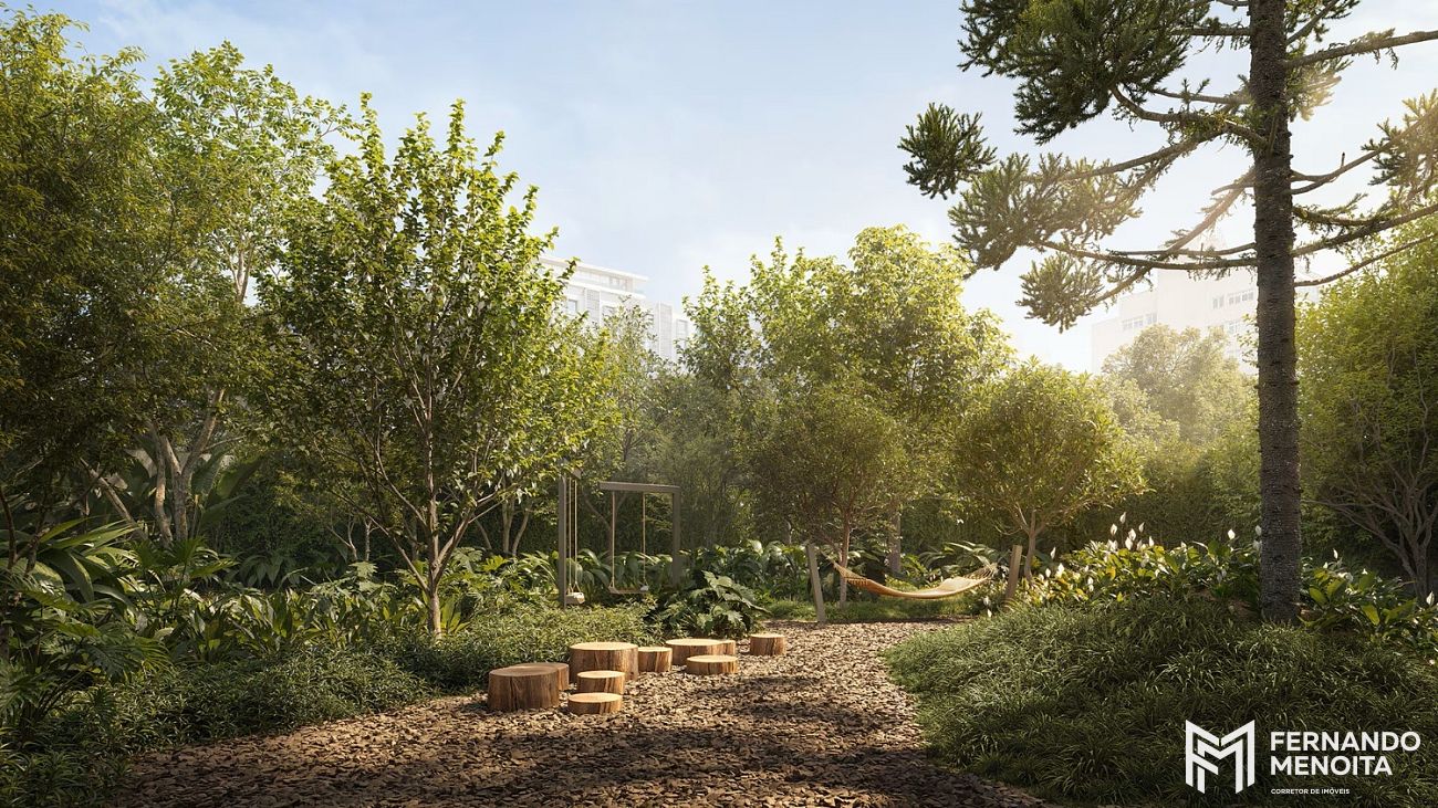 Um dos grandes diferenciais do projeto é a presença de um bosque privativo com mais de 400 m², criando uma experiência rara de contato com a natureza dentro de um ambiente urbano consolidado.