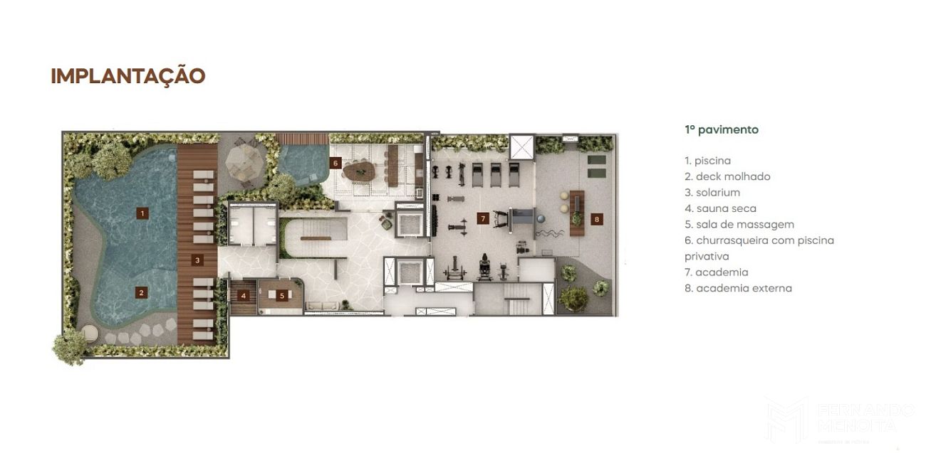 O lazer é distribuído entre térreo e pavimentos dedicados, com ambientes que incluem piscina, solarium, academia, sauna, espaço gourmet, salão de festas, brinquedoteca, pet place e áreas externas integradas ao paisagismo