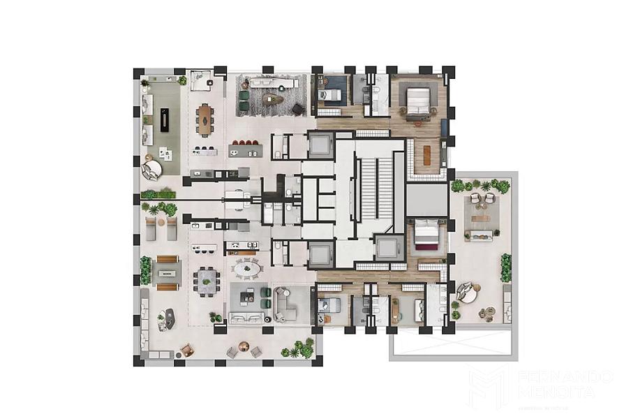 Os apartamentos possuem metragens generosas, variando de 191 m² a 209 m² nas tipologias tipo, além de gardens de até 366 m² e coberturas duplex de até 358 m², todas com hall privativo, plantas bem resolvidas, ambientes amplos e possibilidade de personalização.