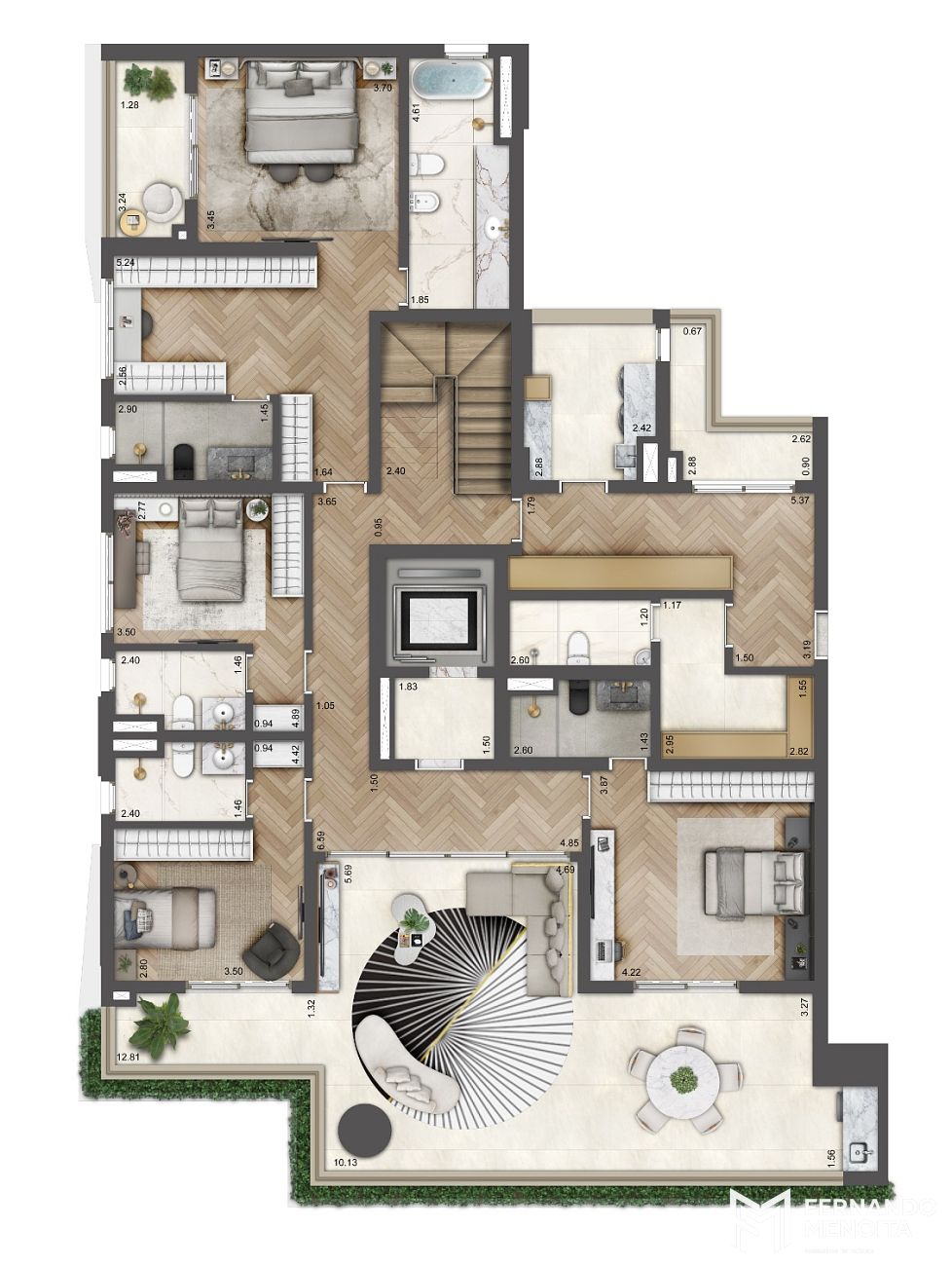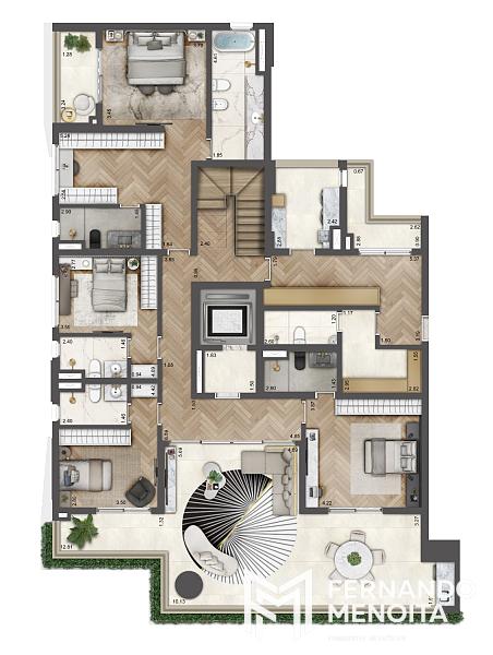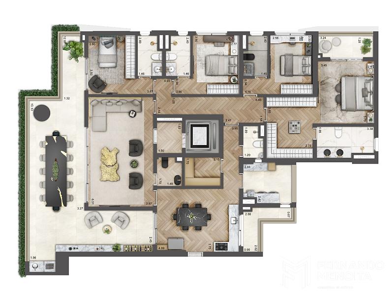 O Soleil Residences apresenta apartamentos amplos de 246 m², com apenas duas unidades por pavimento e hall social privativo, garantindo máxima privacidade, conforto acústico e sensação real de exclusividade. As plantas privilegiam integração entre os ambientes sociais, iluminação natural abundante e ventilação cruzada.