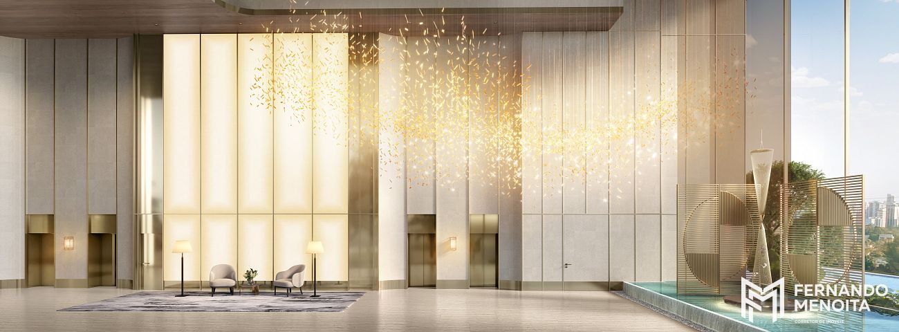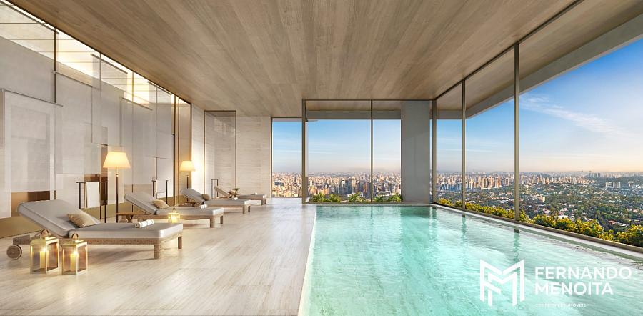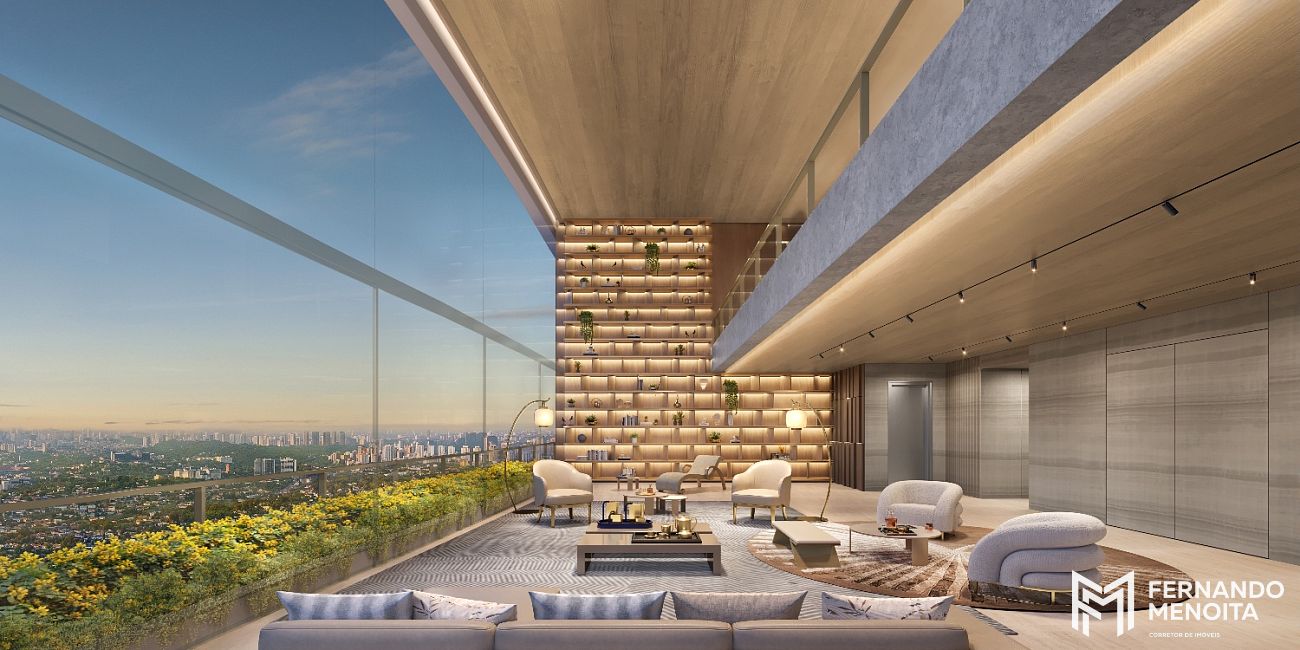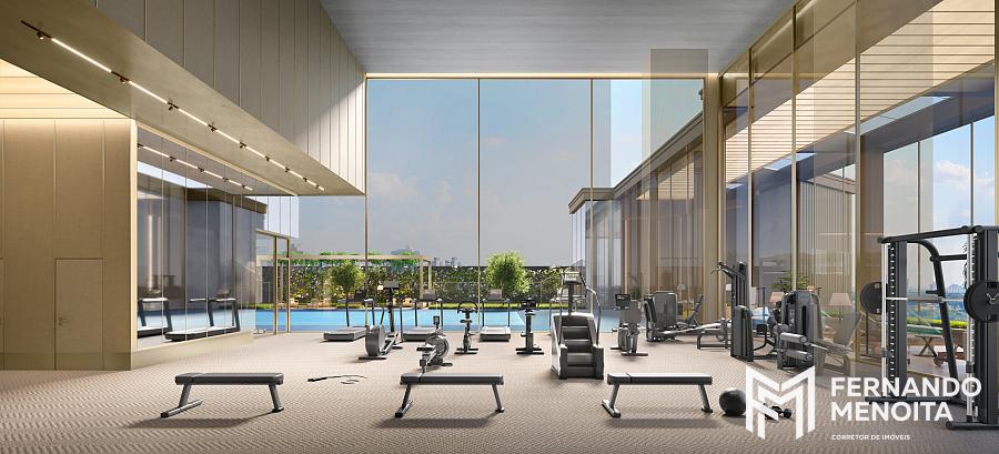 O projeto oferece infraestrutura completa de lazer distribuída em diferentes pavimentos, incluindo piscina coberta e descoberta, quadra de tênis, spa, floating gym, lounges panorâmicos, espaços de wellness, áreas de convivência e ambientes dedicados ao relaxamento e bem-estar.