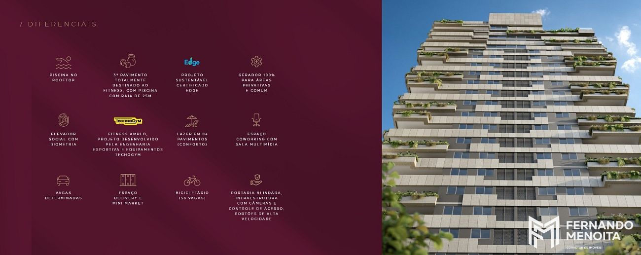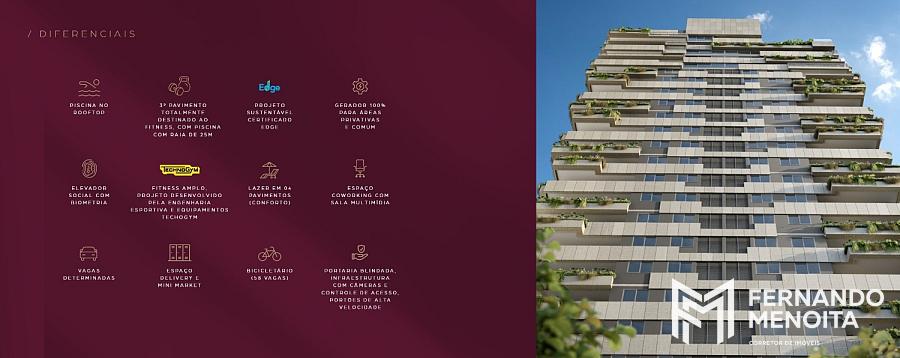 Nas áreas de lazer e conveniência, o empreendimento reúne espaços como lobby, grab&go, pet place, coworking e delivery/lockers, além de ambientes voltados a bem-estar, como fitness, piscina, solarium, sauna e terraços de convivência. O conjunto é complementado por soluções de segurança e eficiência, com controle de acesso por biometria, Wi-Fi nas áreas comuns e certificação EDGE.