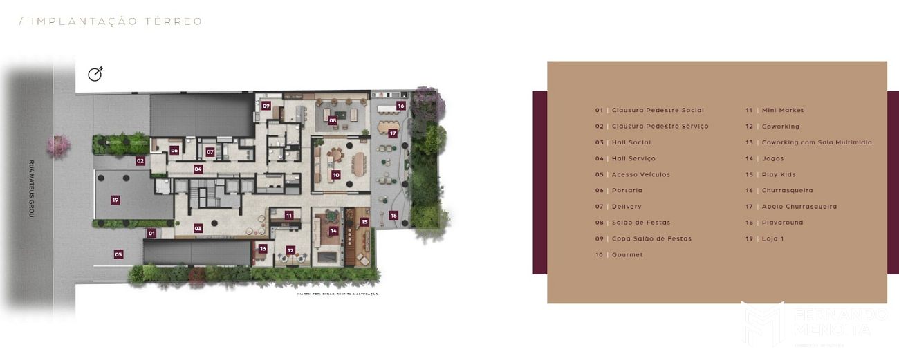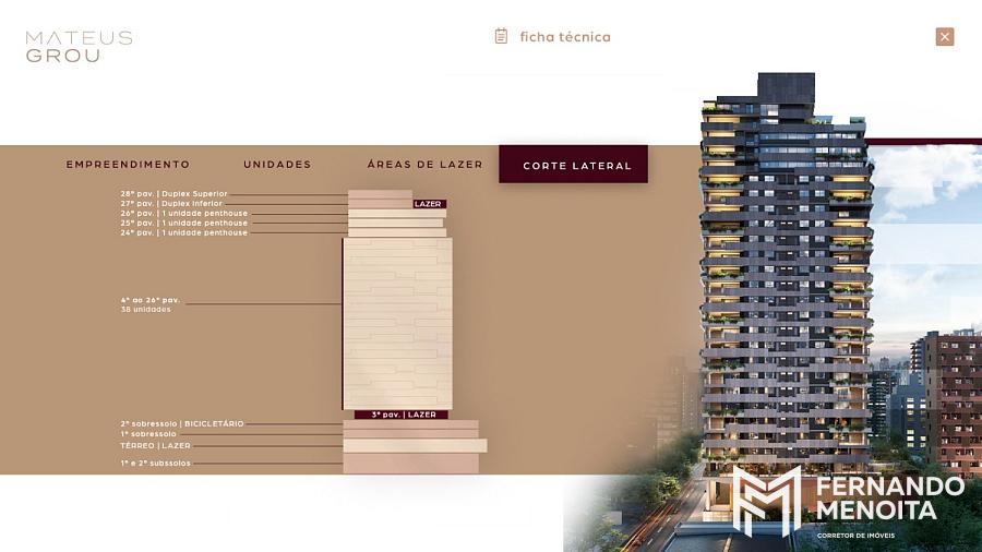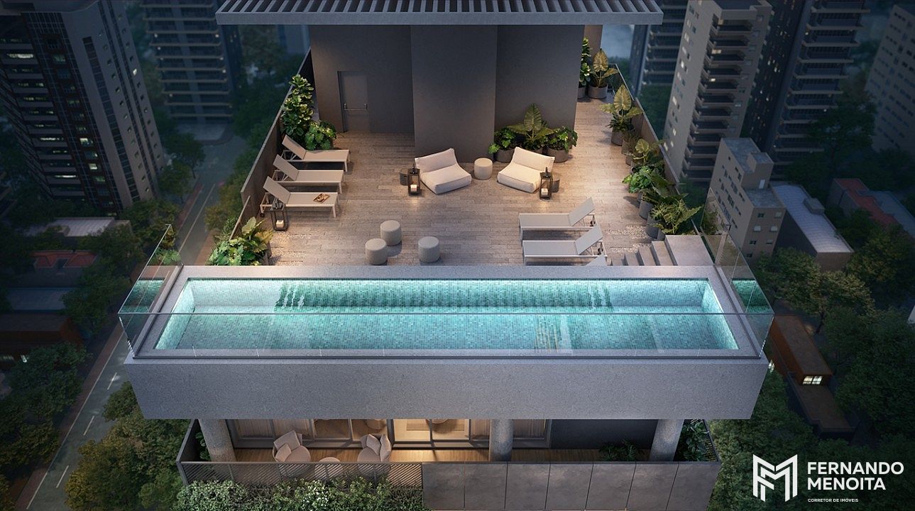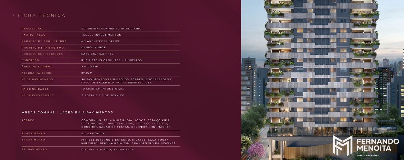 O Mateus Grou é assinado por um time reconhecido: Architects Office (arquitetura), Fernanda Marques Arquitetura (interiores) e Benedito Abbud (paisagismo), reforçando o padrão e a coerência do projeto do térreo ao rooftop.