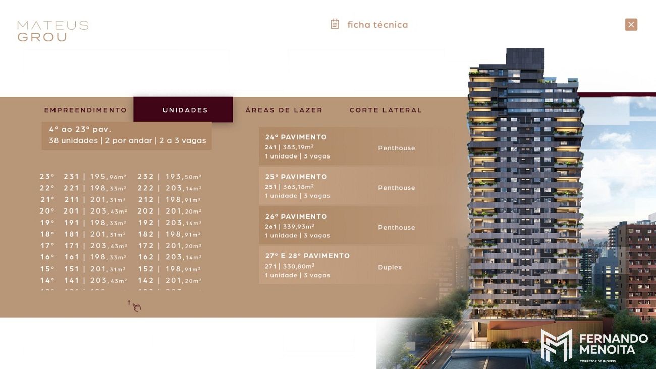 • Linear | Pav. tipo: 4º ao 23º pav. | 36 unid. | 2 unid./andar | 198–200 m² | 3 vg.