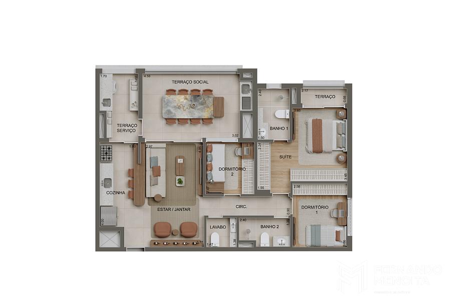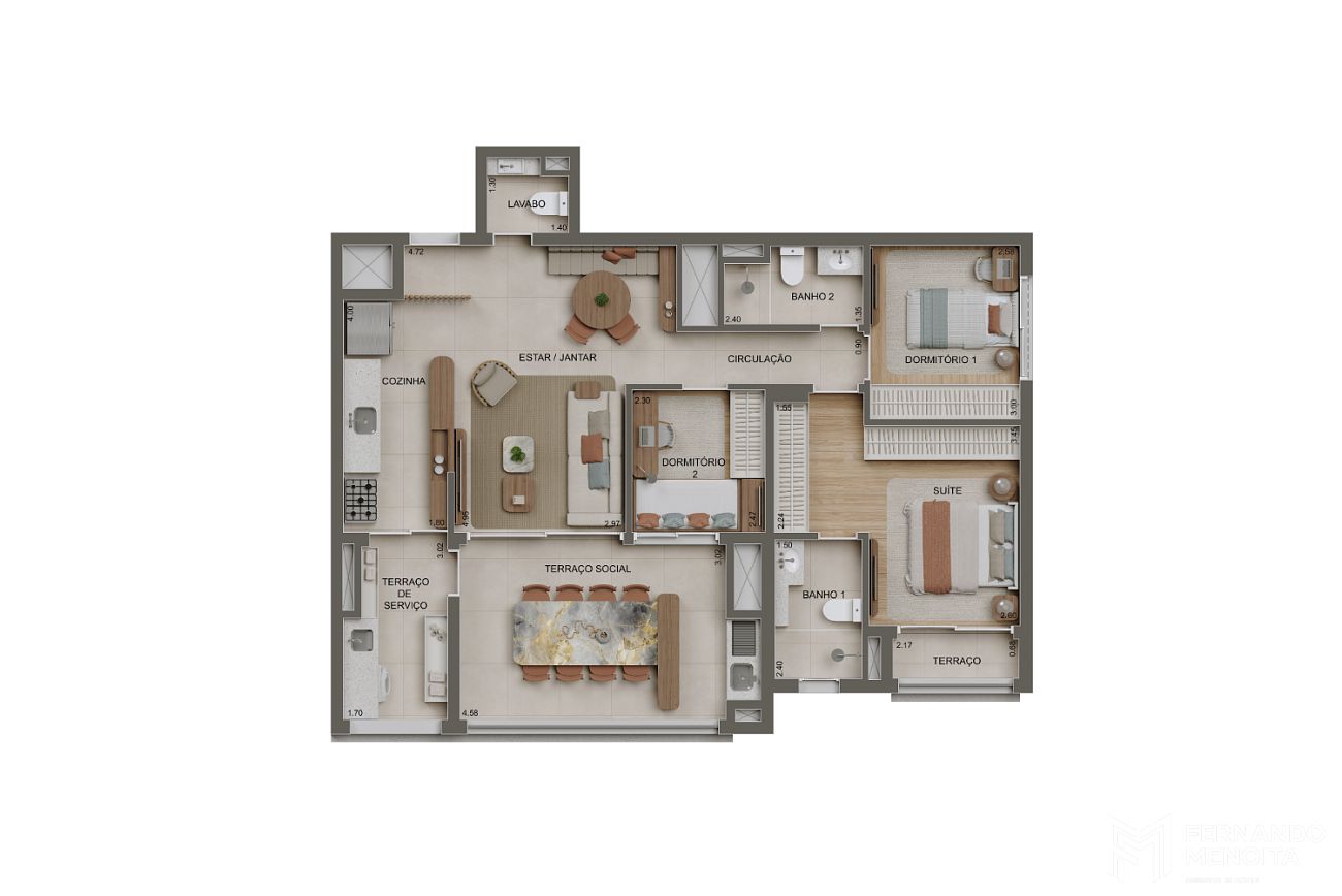 • 100 m² — 3 dormitórios (1 suíte) com lavabo