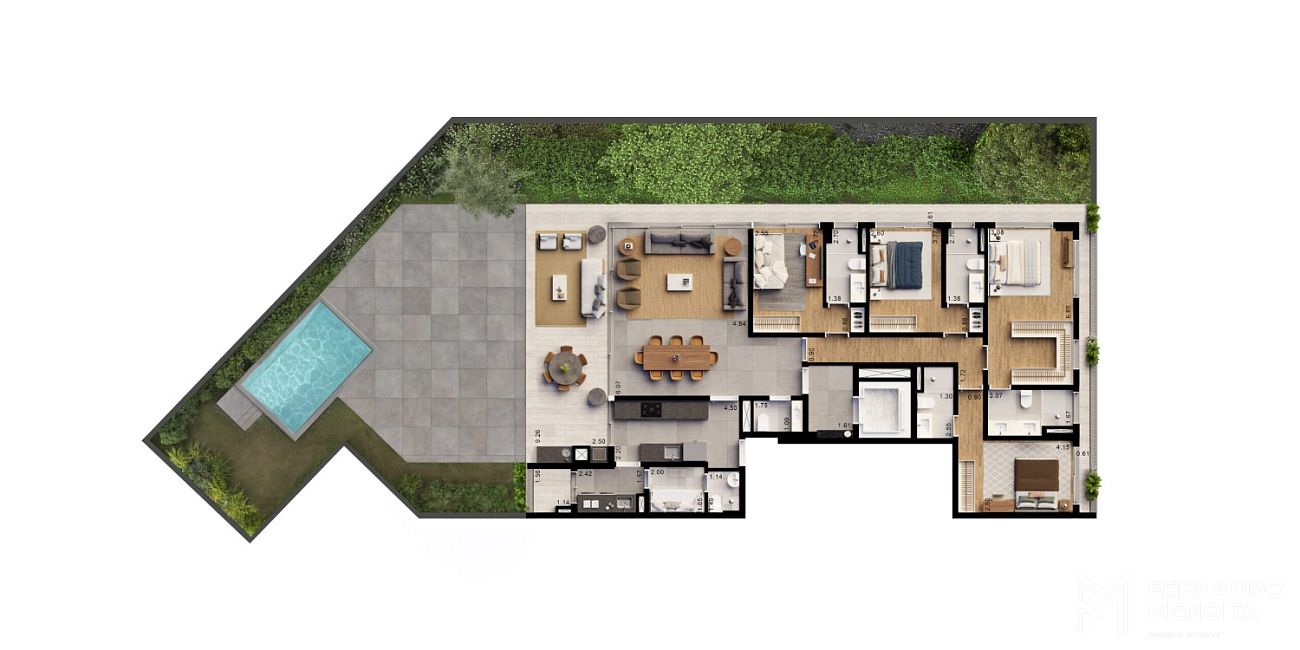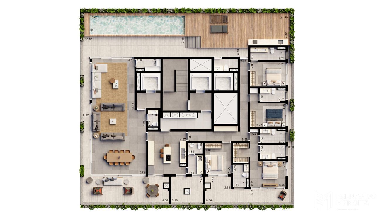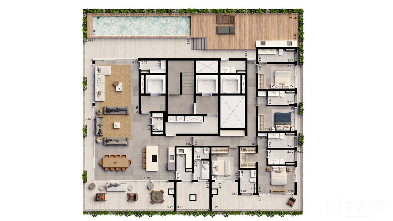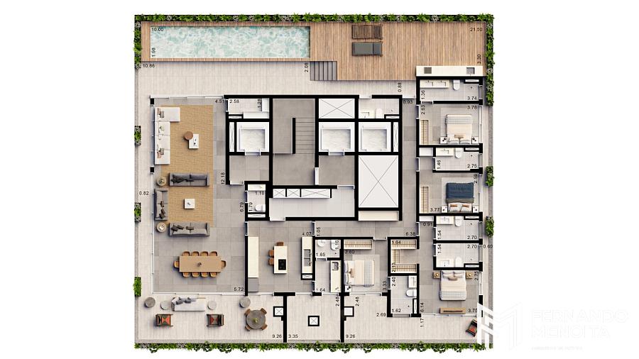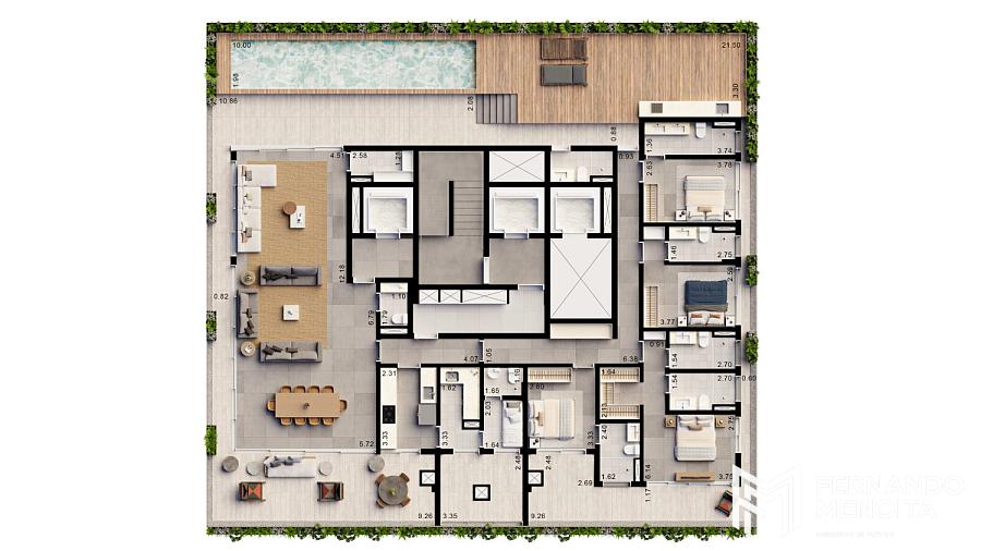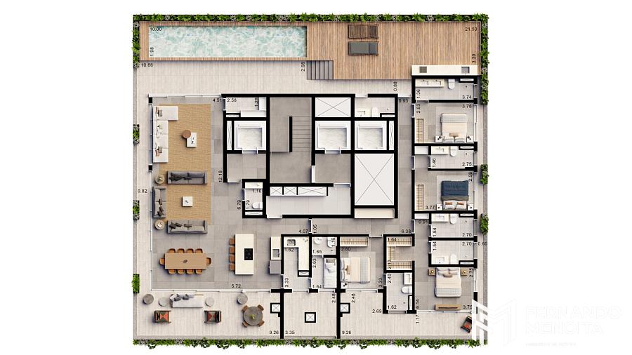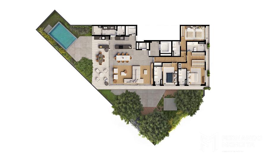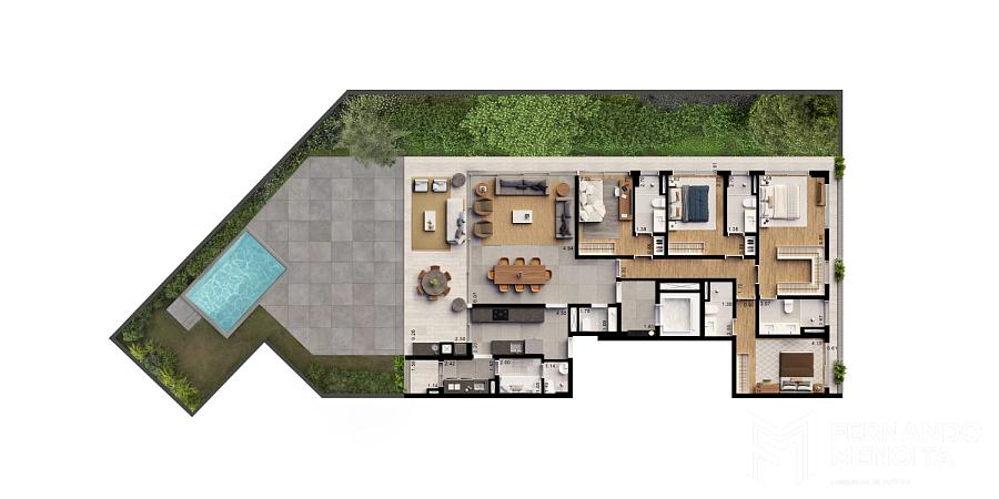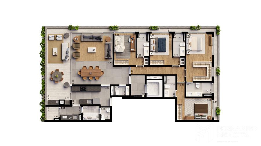 As tipologias foram desenvolvidas para atender diferentes perfis com alto padrão de exigência, com metragens que variam de 171 m² a 402 m². As unidades tipo de 205 m² contam com 4 suítes, enquanto há opções de 184 m² com 3 suítes e 171 m² com 2 suítes. O projeto também contempla unidades exclusivas, como gardens de 364 m² e 394 m² e penthouses de 402 m², elevando o nível de sofisticação com áreas externas privativas e soluções arquitetônicas diferenciadas.