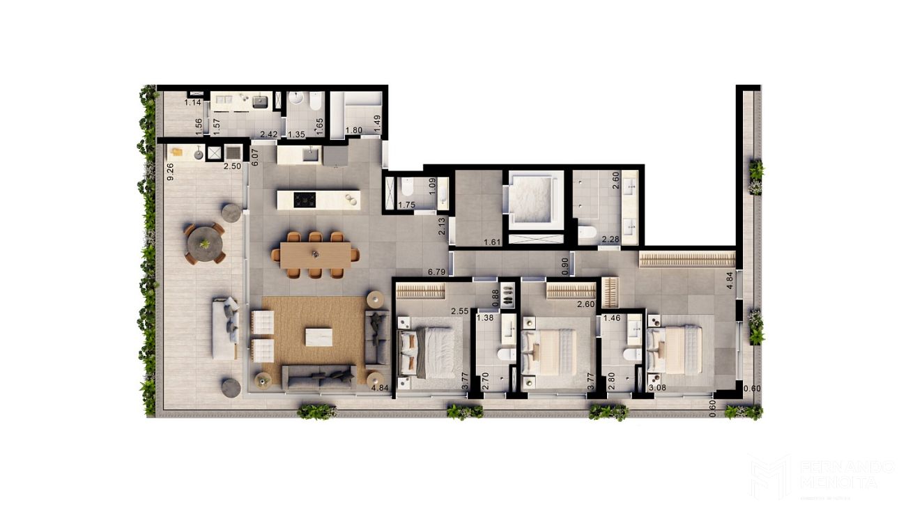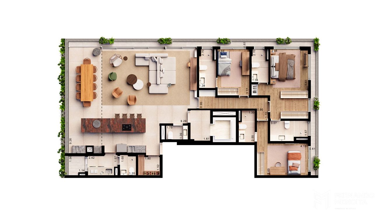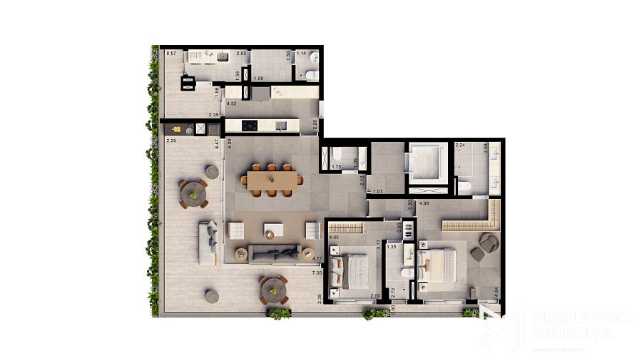Os apartamentos se destacam por suas varandas panorâmicas perimetrais, amplos caixilhos do piso ao teto, integração total entre living e terraço e excelente aproveitamento de iluminação e ventilação naturais. As plantas oferecem ainda infraestrutura para automação, ar-condicionado, tomadas USB e terraço técnico, proporcionando conforto e tecnologia no dia a dia.