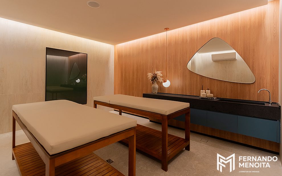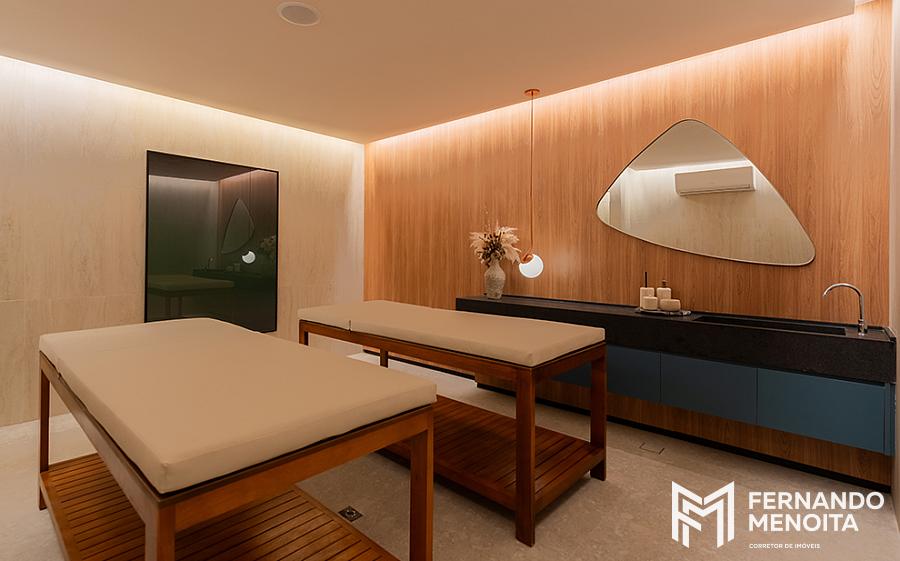 Outro diferencial marcante está na experiência de bem-estar assinada pela Amman Consultoria, com um verdadeiro home spa dentro do condomínio, ambientes voltados a experiências sensoriais, aromaterapia, cromoterapia, texturas, madeira, fibras e plantas, elevando o padrão de relaxamento e exclusividade do empreendimento.