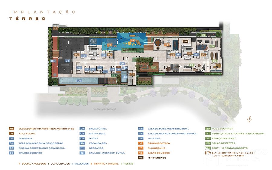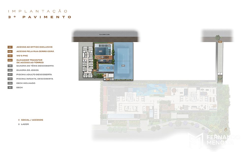 No 3º pavimento, o projeto amplia a experiência de lazer com quadra de tênis descoberta com dimensões oficiais, quadra de esportes descoberta, piscina descoberta, piscina infantil descoberta, deck molhado, deck e praça, compondo um condomínio de alto padrão com forte vocação para convivência, wellness, esportes e vida em família.