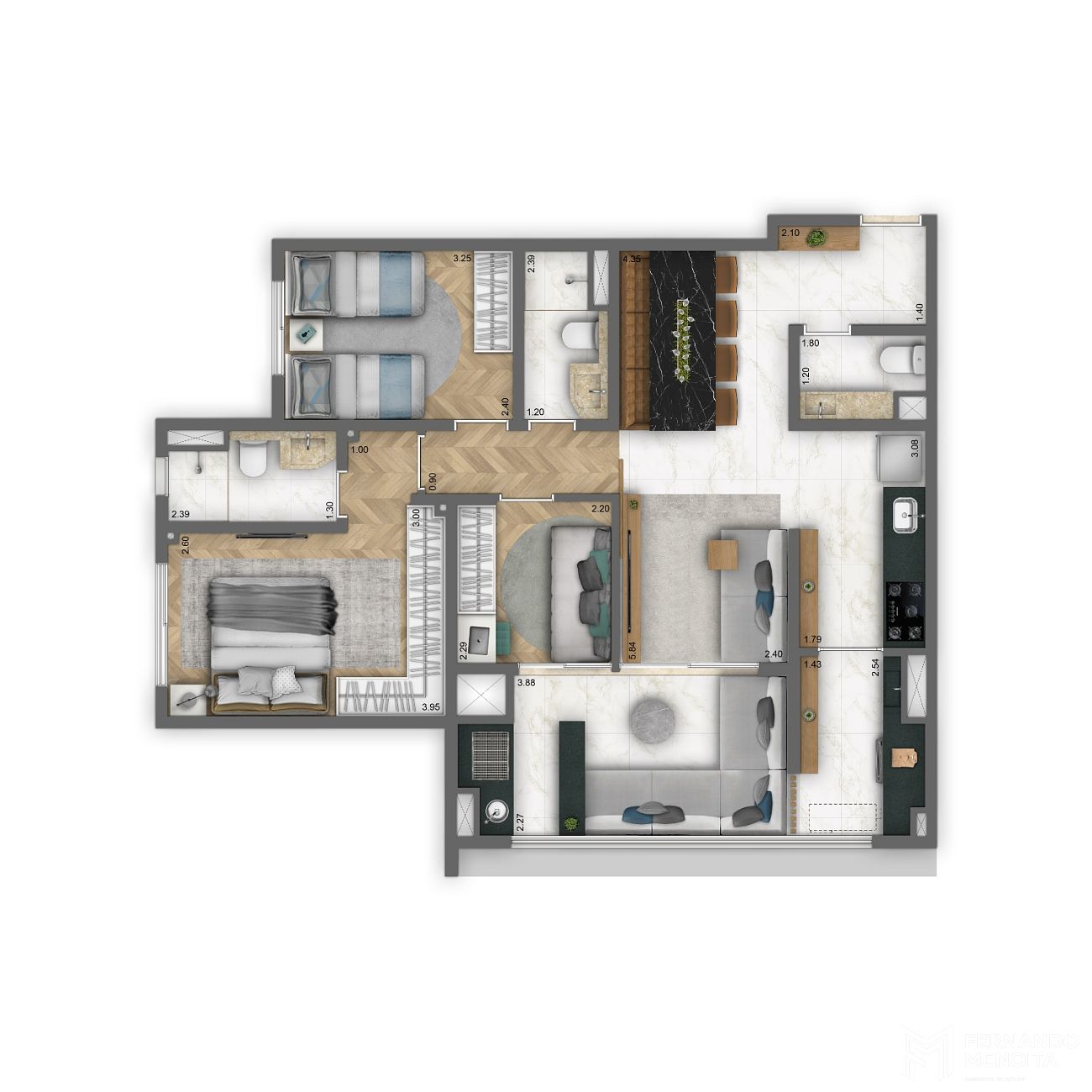 Além disso, o empreendimento incorpora soluções modernas como car sharing, minimarket interno, infraestrutura para Wi-Fi nas áreas comuns e monitoramento inteligente, alinhando tecnologia, praticidade e estilo de vida contemporâneo.