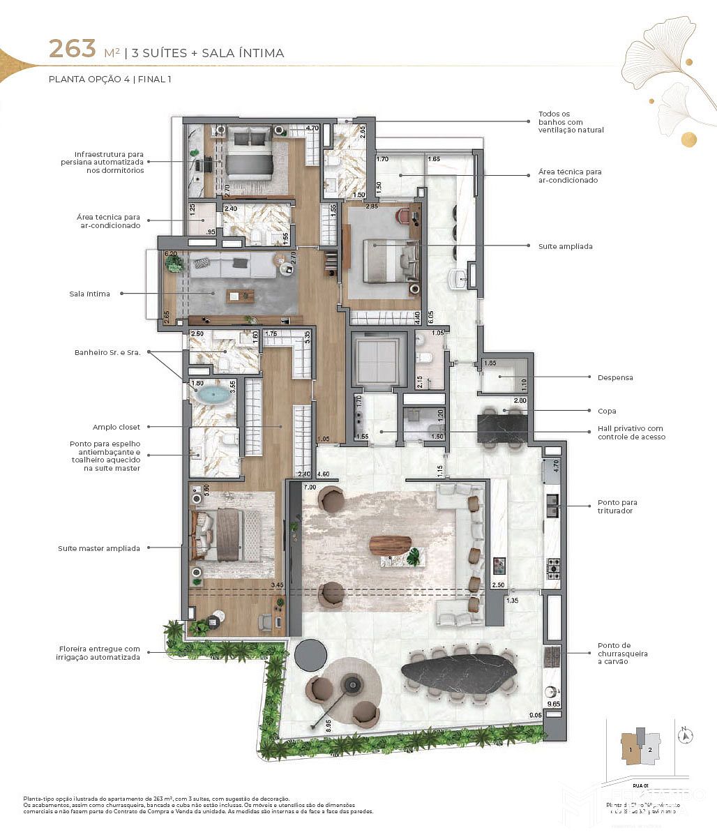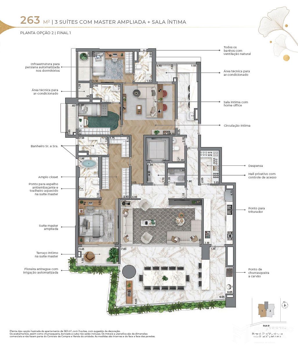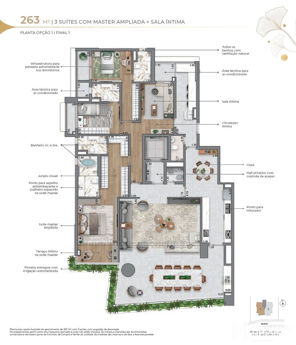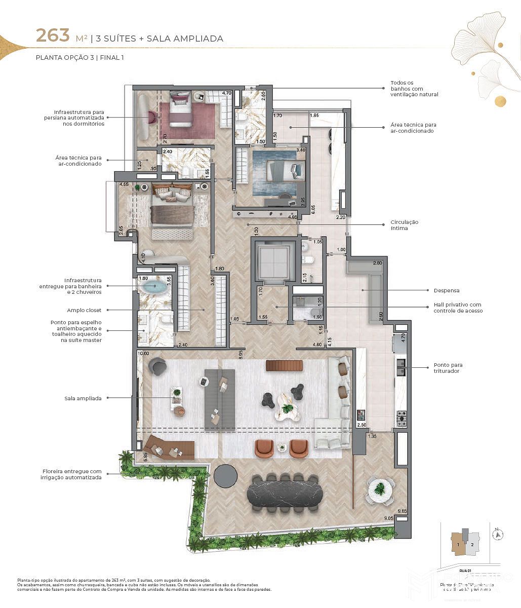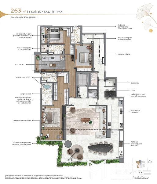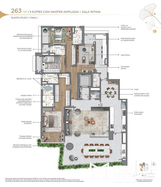 • 263 m² (opções): 3 suítes com master ampliada + sala íntima