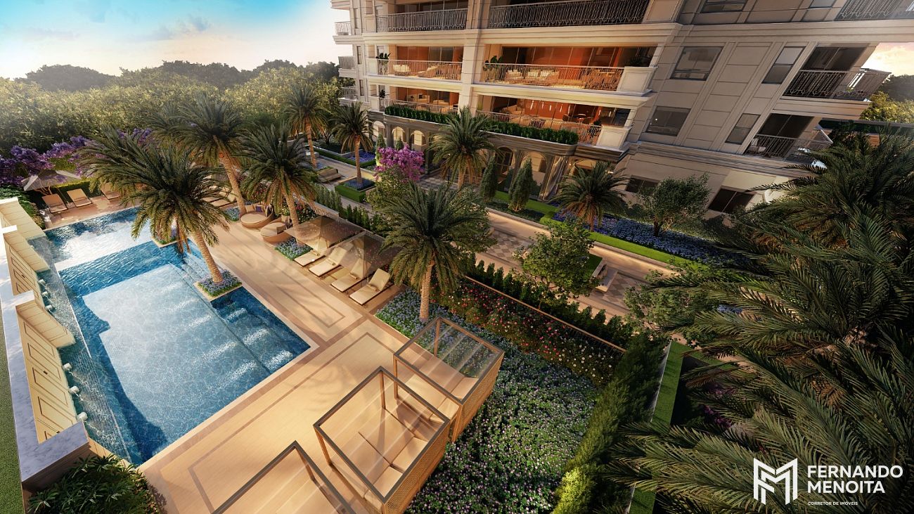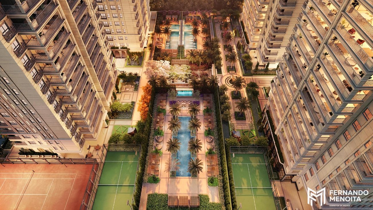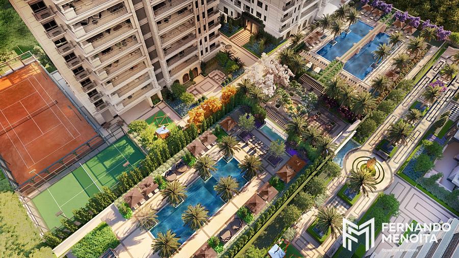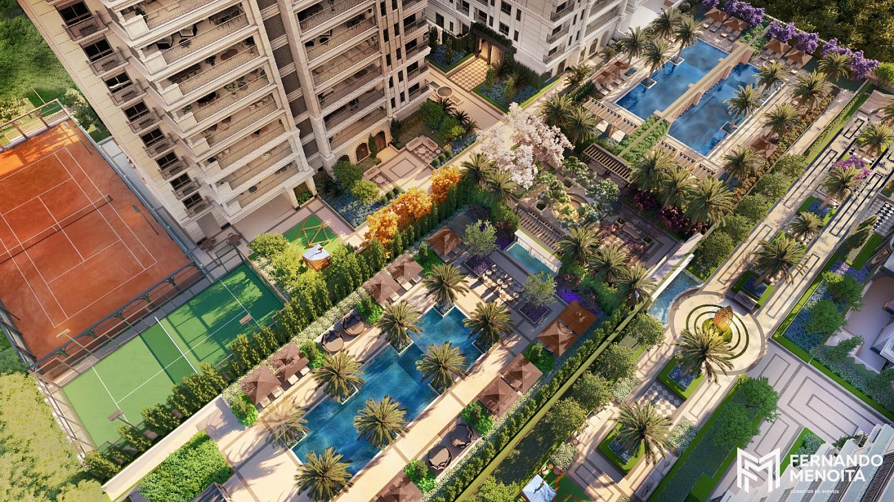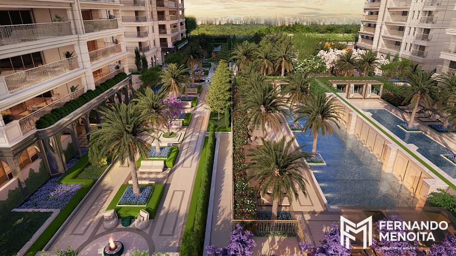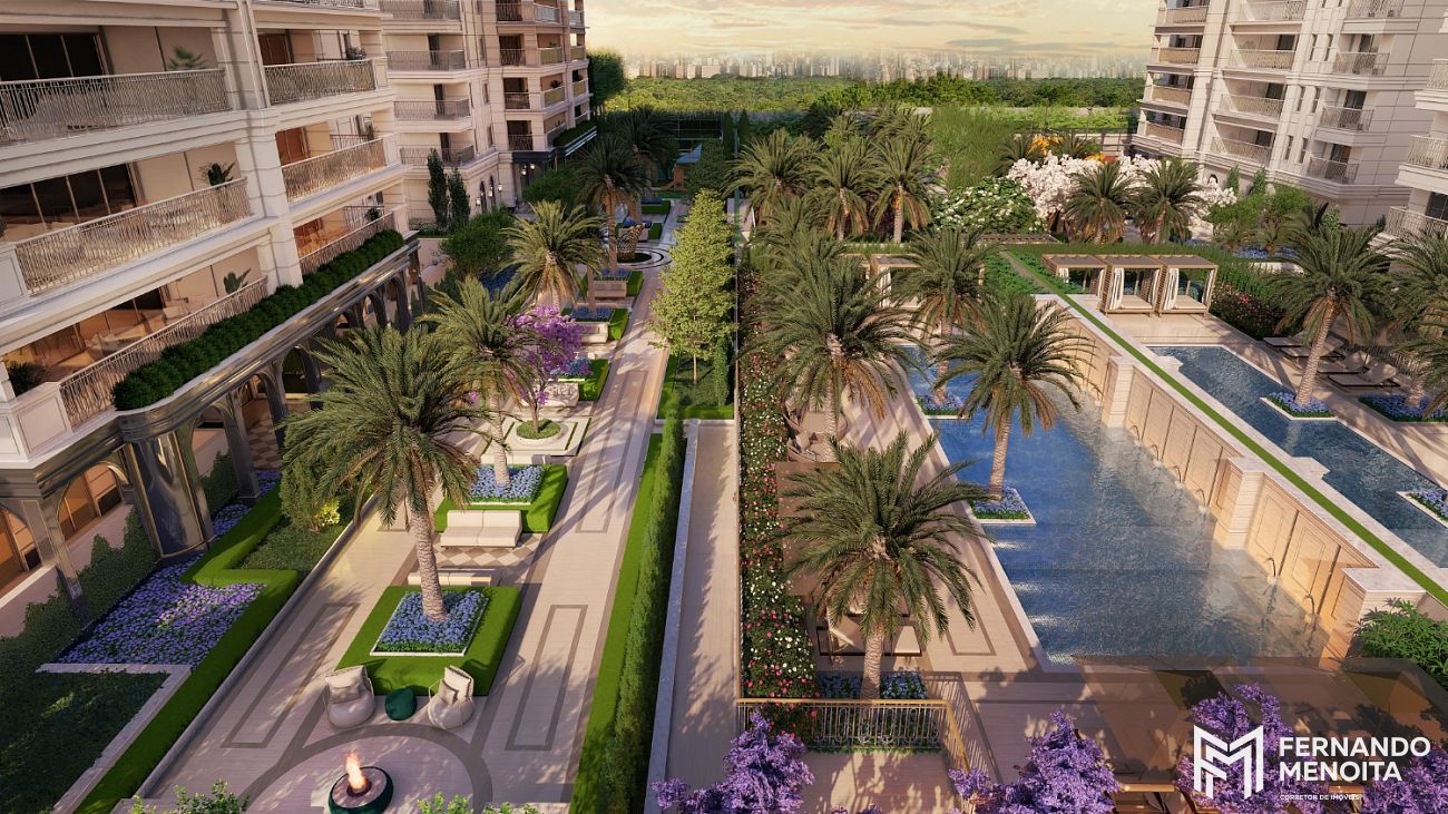 A arquitetura segue uma linguagem clássica reinterpretada com leveza contemporânea, valorizando simetria, proporção e materiais nobres, enquanto o paisagismo assinado pela EDSA cria uma experiência sensorial com praças e alamedas que desaceleram o tempo e elevam o cotidiano.