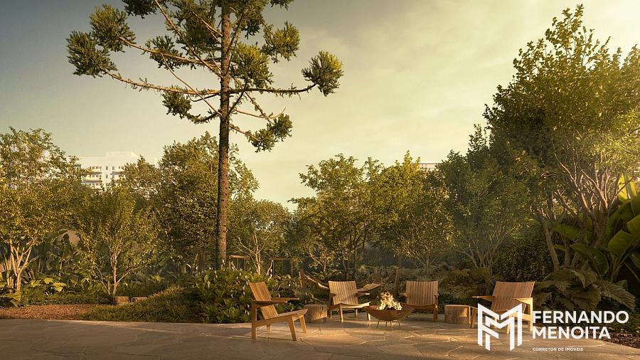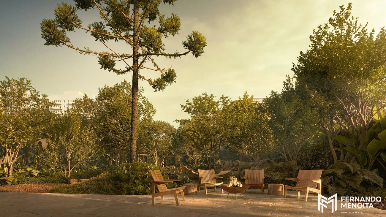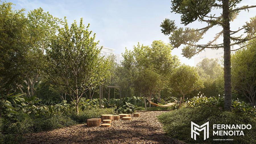 Um dos grandes diferenciais do projeto é a presença de um bosque privativo com mais de 400 m², criando uma experiência rara de contato com a natureza dentro de um ambiente urbano consolidado.