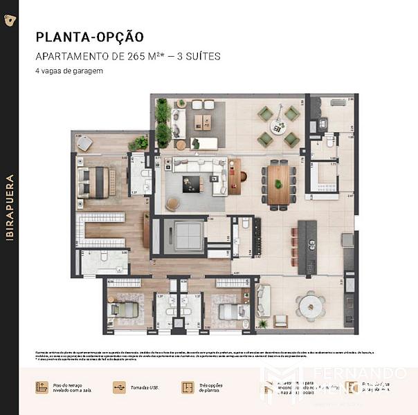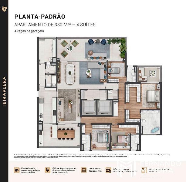 Inspirada no Parque Ibirapuera, a torre traduz um estilo de vida contemporâneo, onde arquitetura, paisagismo, tecnologia e sustentabilidade coexistem em perfeita harmonia. Os apartamentos possuem plantas amplas e bem resolvidas, com metragens que variam de 265 a 330 m², além de unidades duplex de 422 a 552 m², oferecendo conforto absoluto, privacidade e sofisticação em cada detalhe.