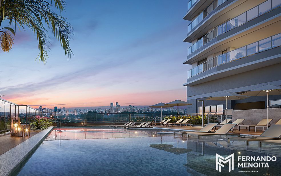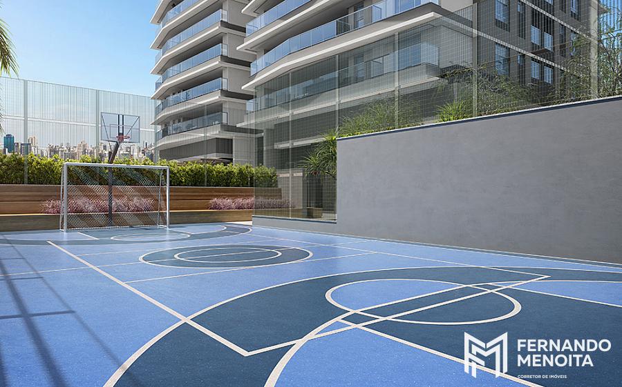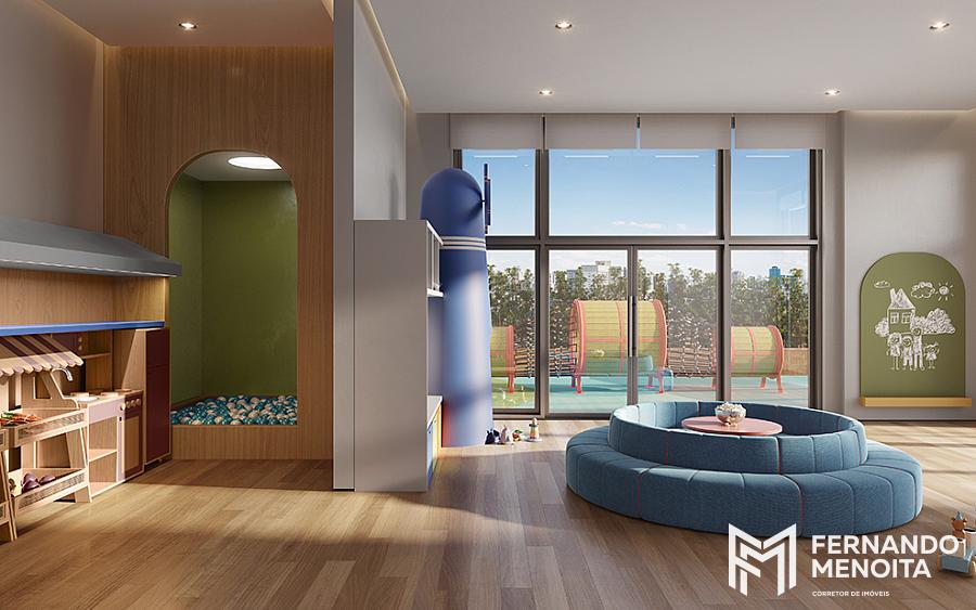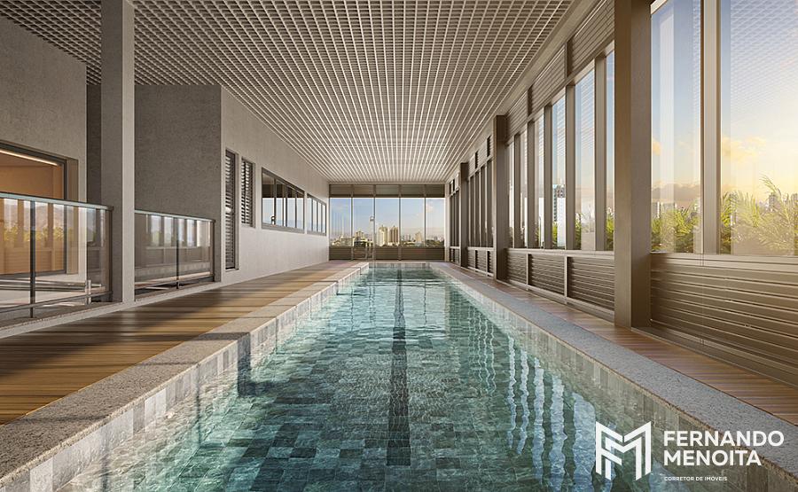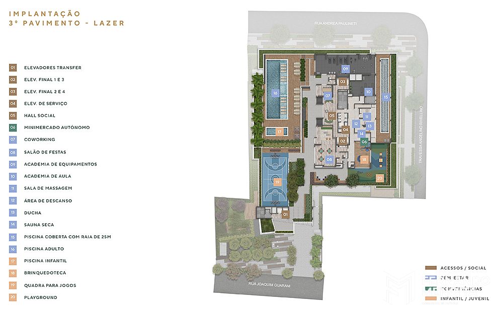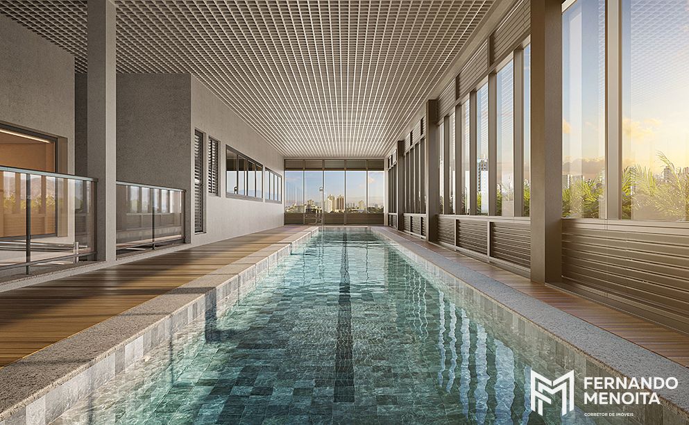 O empreendimento apresenta um conjunto completo de lazer e bem-estar distribuído em diferentes pavimentos, incluindo piscina descoberta, piscina coberta com raia de 25 metros, academia completa, sala de massagem, sauna seca, coworking, salão de festas, brinquedoteca, playground e quadra para jogos, criando uma experiência de moradia completa.