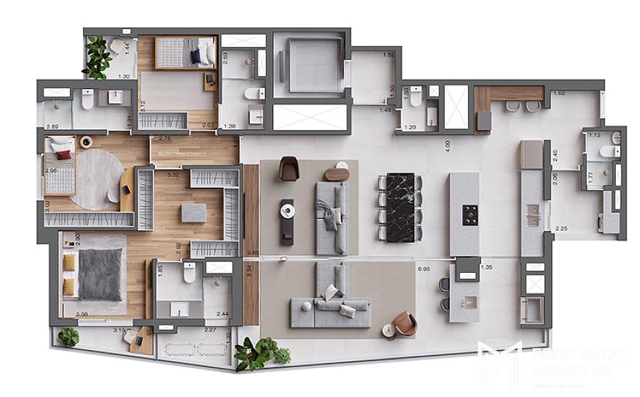 As plantas foram concebidas para oferecer funcionalidade e sofisticação, com hall social privativo, acesso de serviço independente, terraço amplo com churrasqueira, previsão para ar-condicionado, suíte master com closet e excelente iluminação natural proporcionada por caixilhos com persianas integradas.