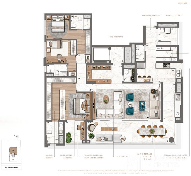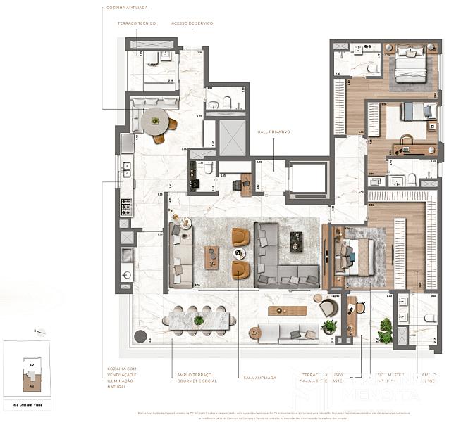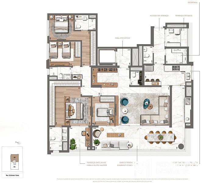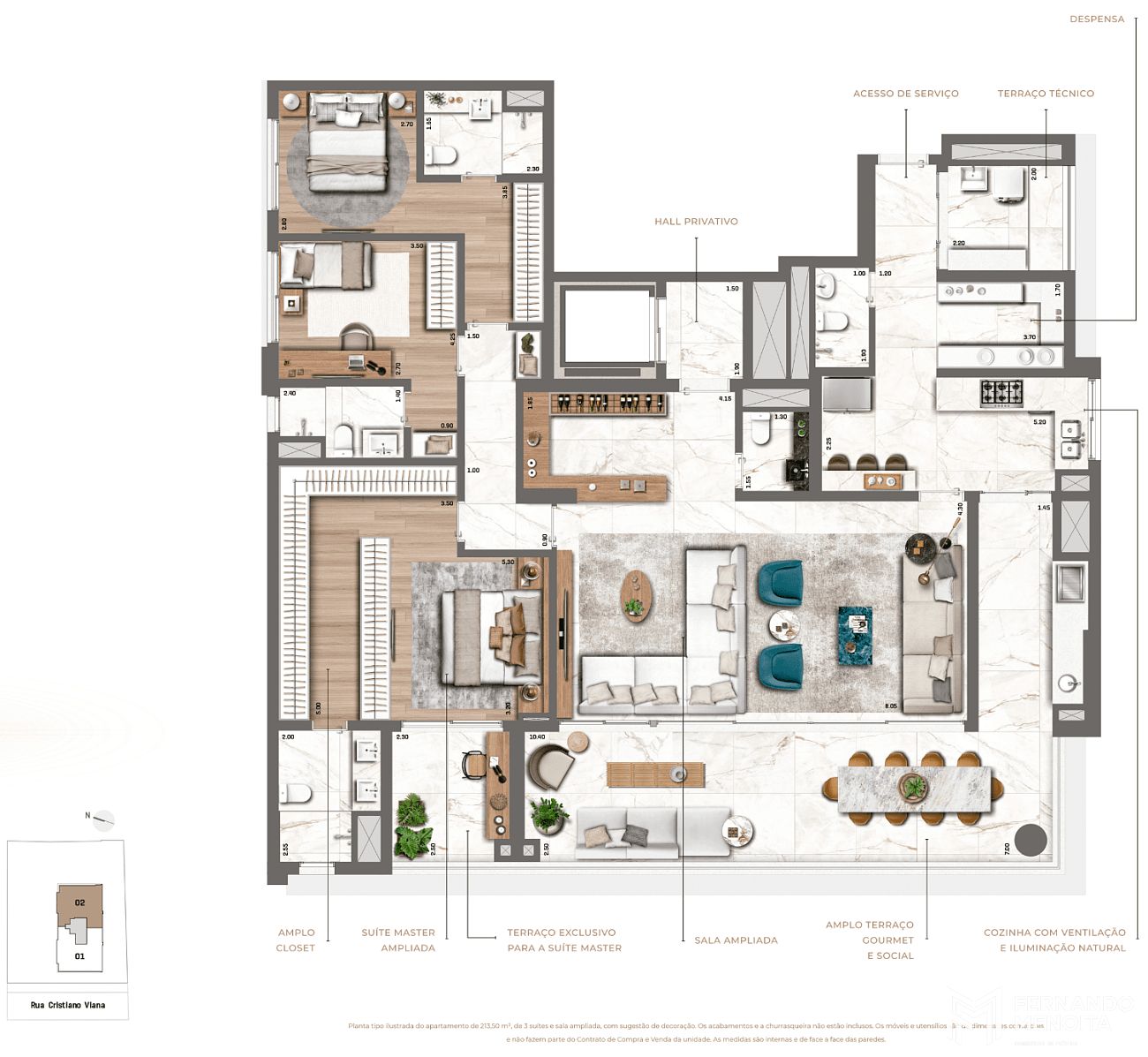 Os apartamentos foram projetados com amplo terraço gourmet e social, integração total entre ambientes, cozinha com ventilação e iluminação natural, terraço exclusivo para a suíte master e possibilidade de personalização com diferentes layouts. O projeto contempla ainda diferenciais como banho Sr. e Sra., closet ampliado e espaços flexíveis que valorizam conforto e sofisticação.