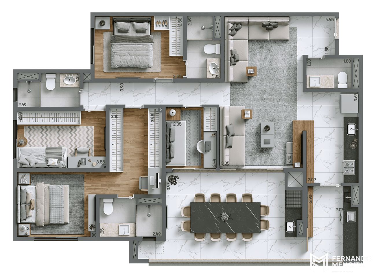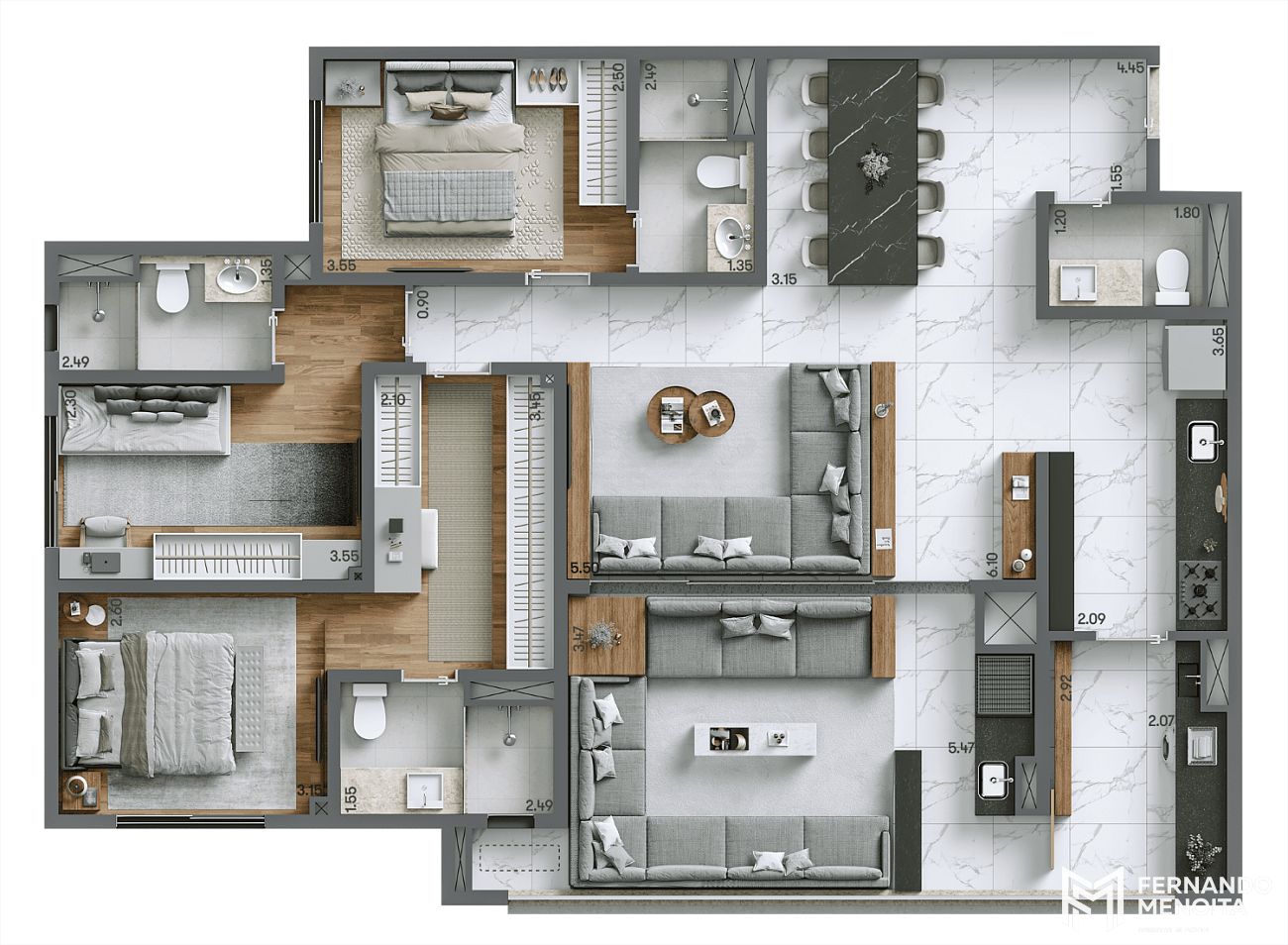 • 98,90 m² – planta tipo: 3 quartos | 1 suíte | 2 vagas