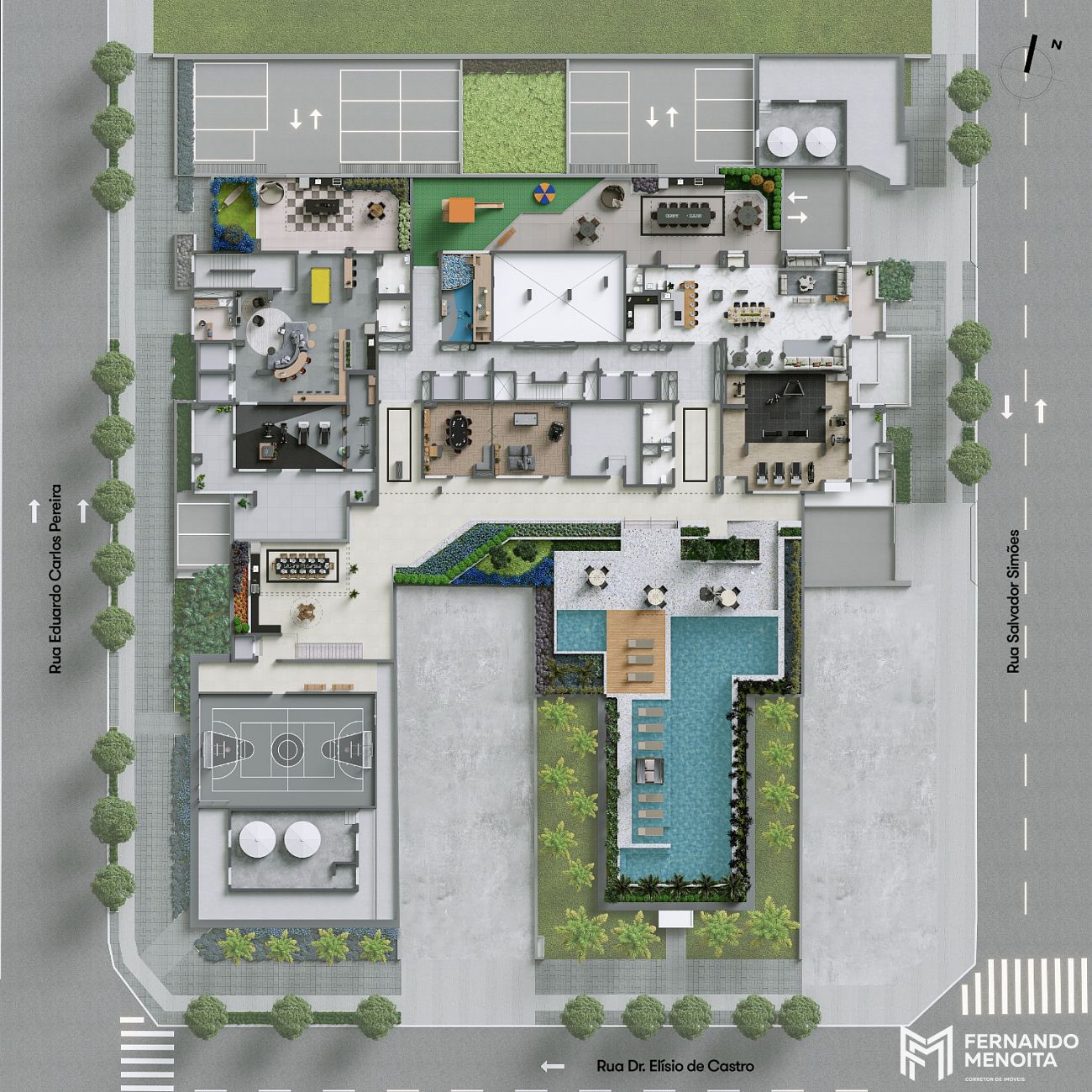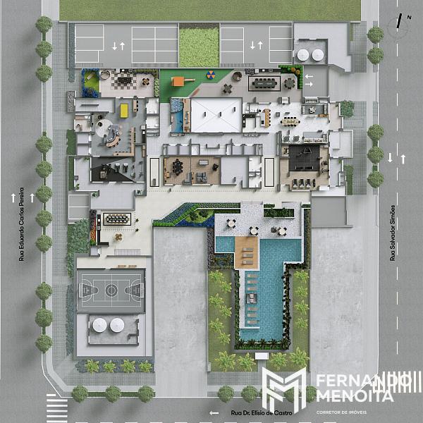 • Pavimento lazer: hall social | salão de festas | academia | jogos teen | jogos adulto | brinquedoteca | playground | churrasqueira | piscina infantil | solarium | deck molhado | spa | piscina com raia de 20 m | quadra recreativa