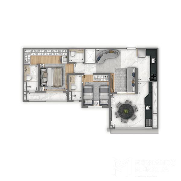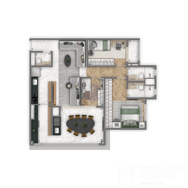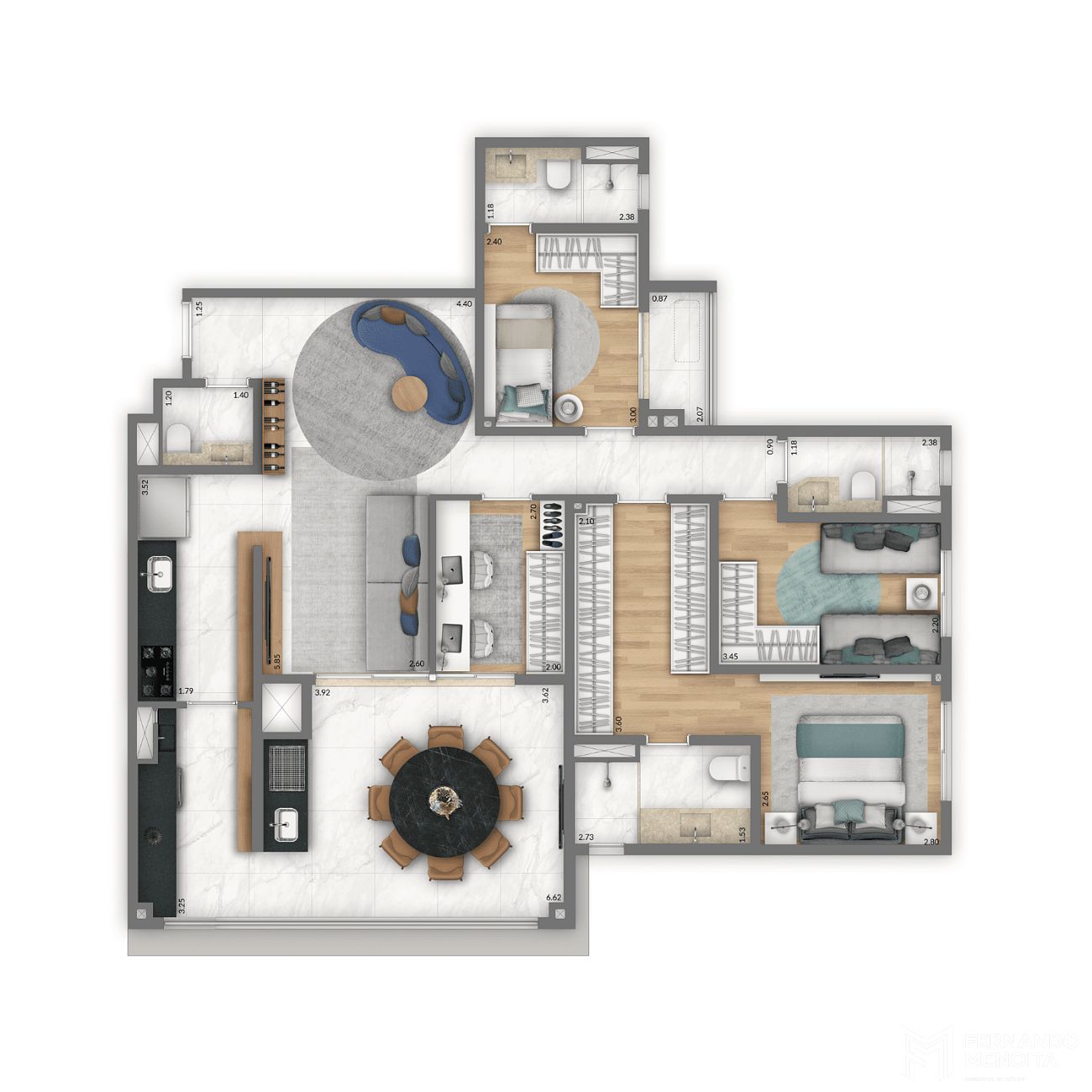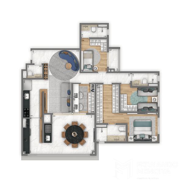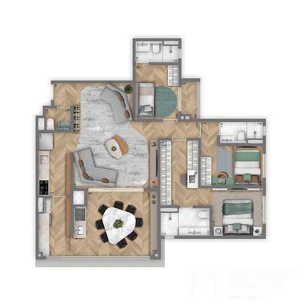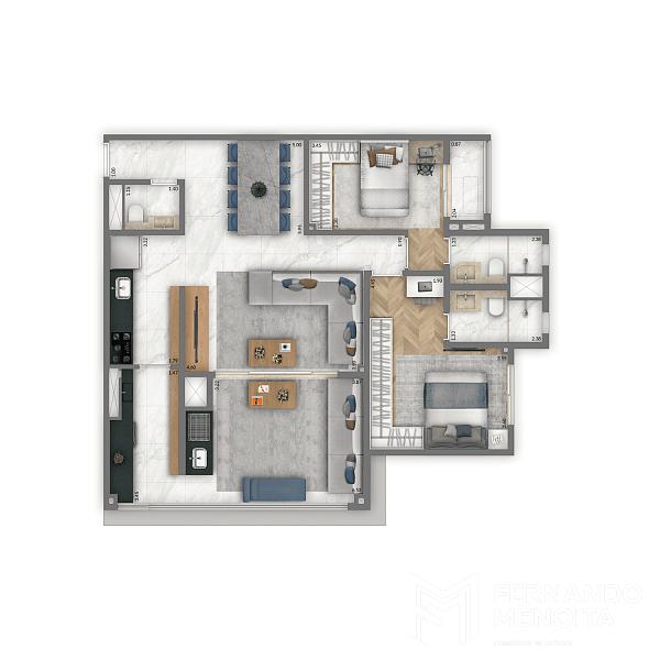 As unidades foram projetadas com plantas modernas e funcionais, com metragens que variam de aproximadamente 74 m² a 115 m², incluindo opções de 2 suítes, 3 dormitórios com suíte e 3 suítes, além de alternativas com ampliação de ambientes.
