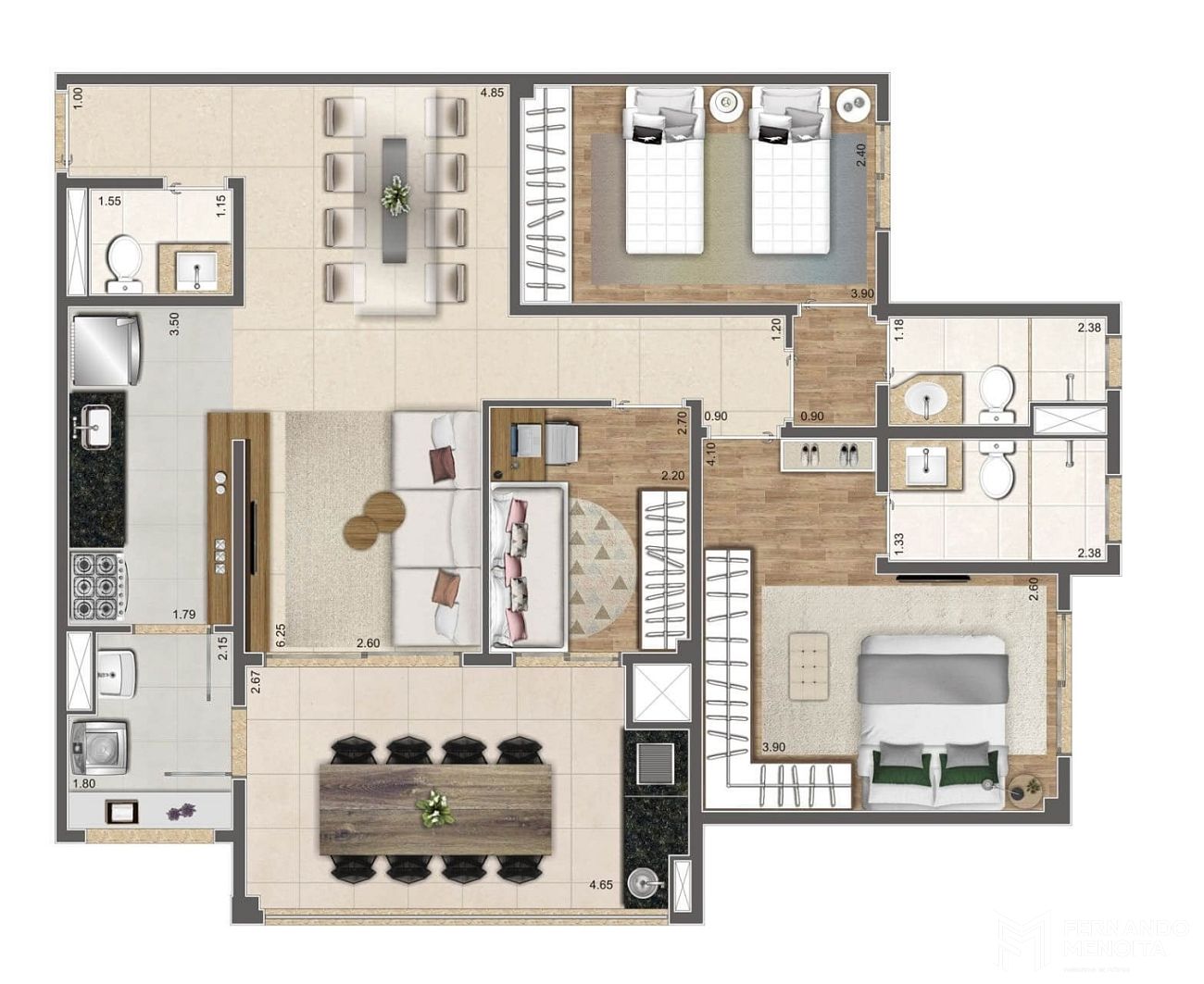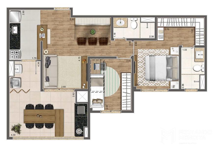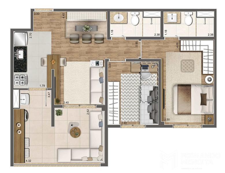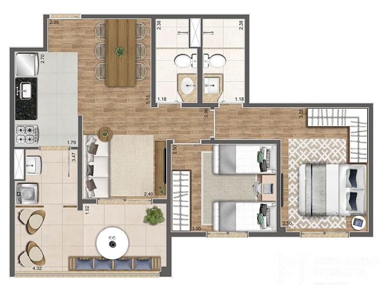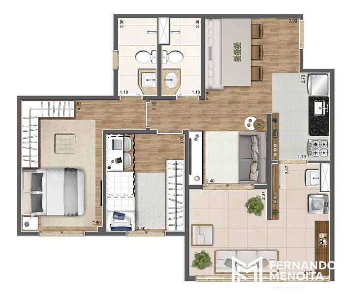• 64,10 m² – 2 dormitórios (1 suíte) – sala ampliada – 1 vaga