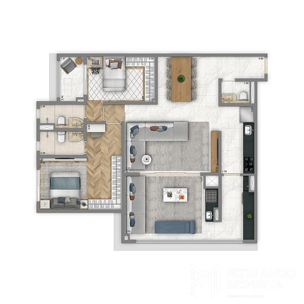 • 75,90 m² – 2 dormitórios (2 suítes) – 1 vaga