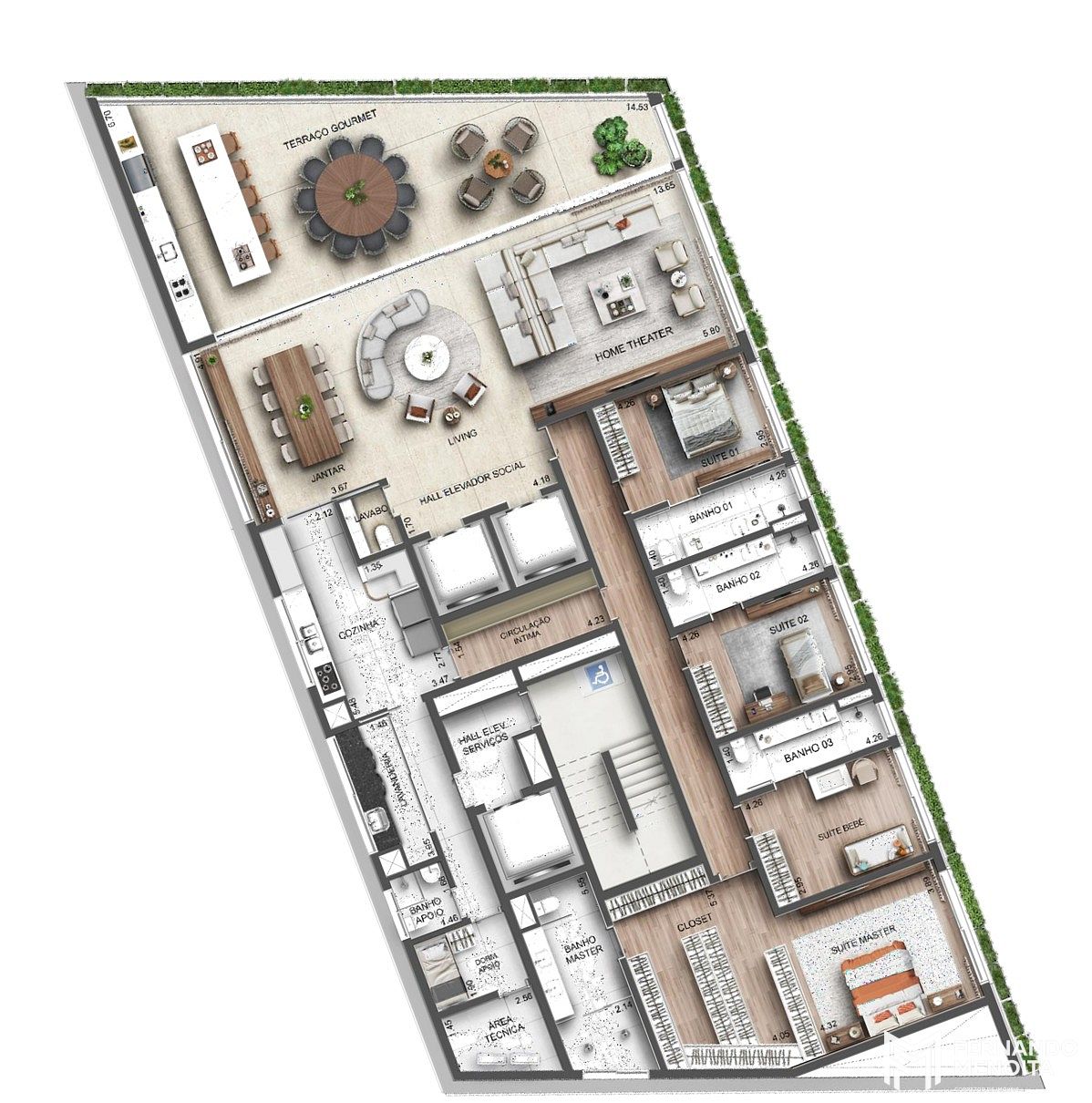 • Apartamento tipo: 397 m² a 421 m² (produto médio aproximado: 413 m²) | 4 suítes | 5 vagas