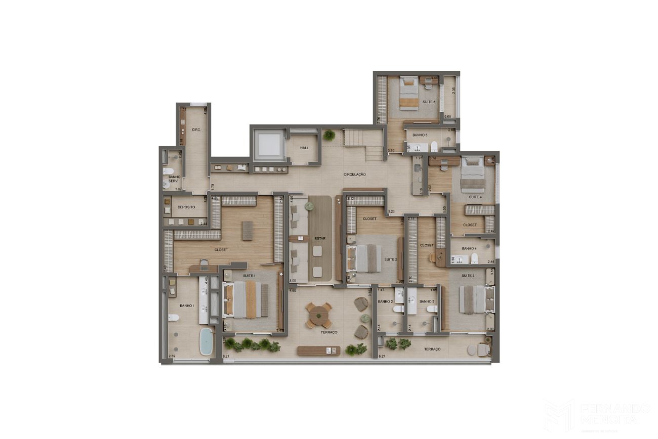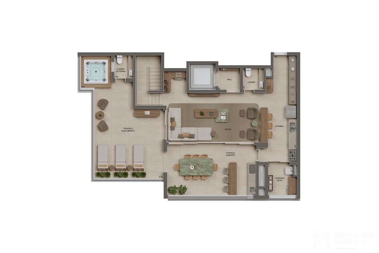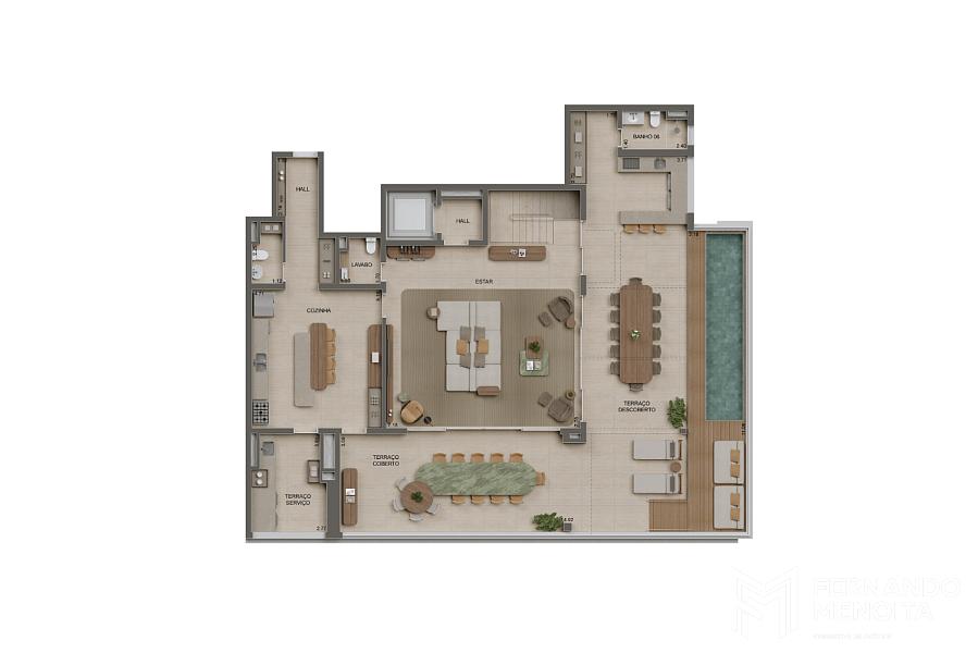 As torres residenciais contam com unidades amplas e sofisticadas, com metragens que vão de 106 m² a 243 m² nas plantas tipo, além de coberturas duplex de 260 m², 480 m² e 485 m², com configurações de até 5 suítes, proporcionando alto nível de exclusividade e conforto.