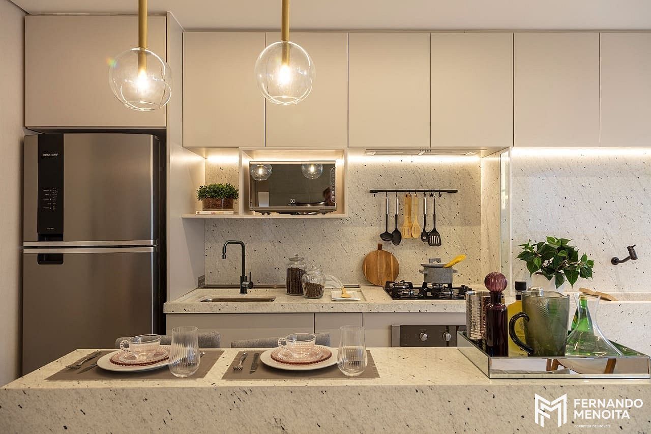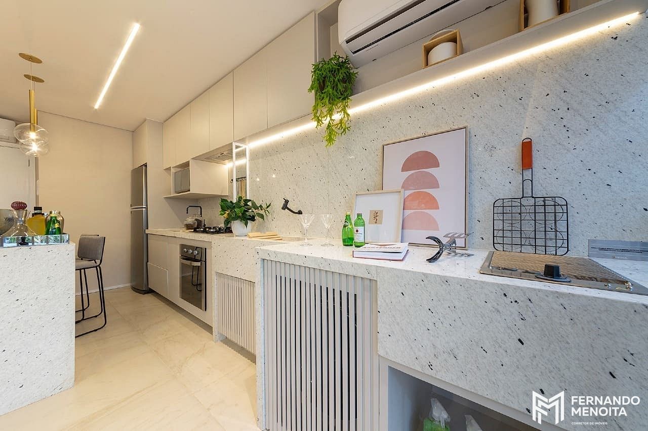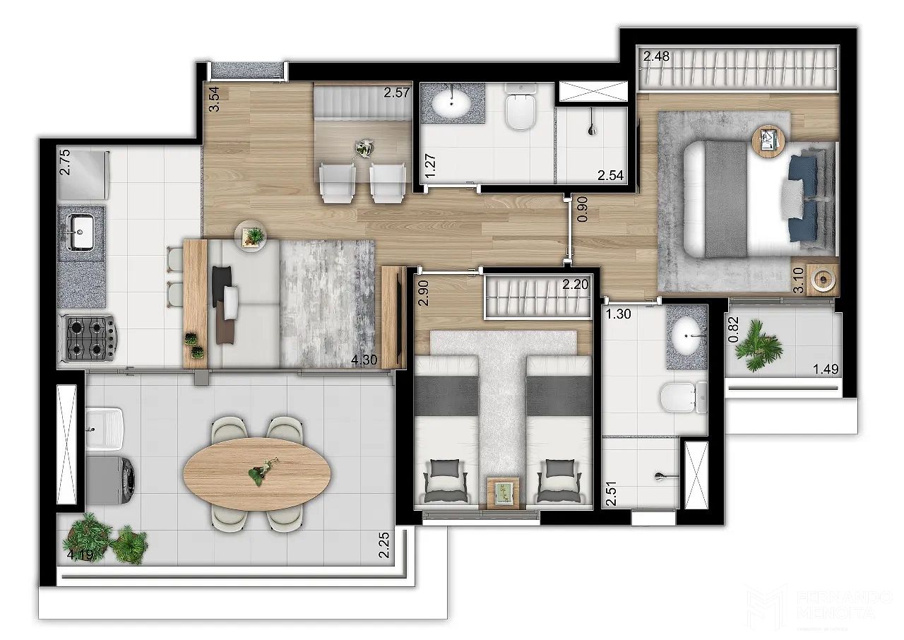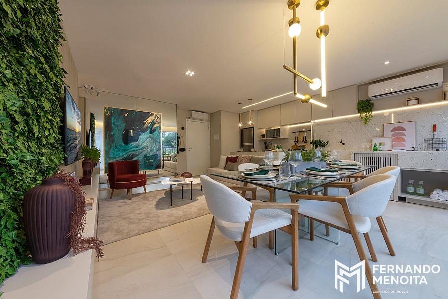 São 2 torres com apartamentos de 56 m² e 79 m², ambos com 1 vaga. A planta de 56 m² oferece 2 dormitórios (sendo 1 suíte), e a de 79 m² conta com 3 dormitórios (também com 1 suíte), com layouts confortáveis para a rotina. As unidades trazem diferenciais que elevam o conforto, como infraestrutura para ar-condicionado nos dormitórios e sala, piso da área social nivelado com o terraço, água quente na cozinha e banheiros e ponto elétrico para grill.