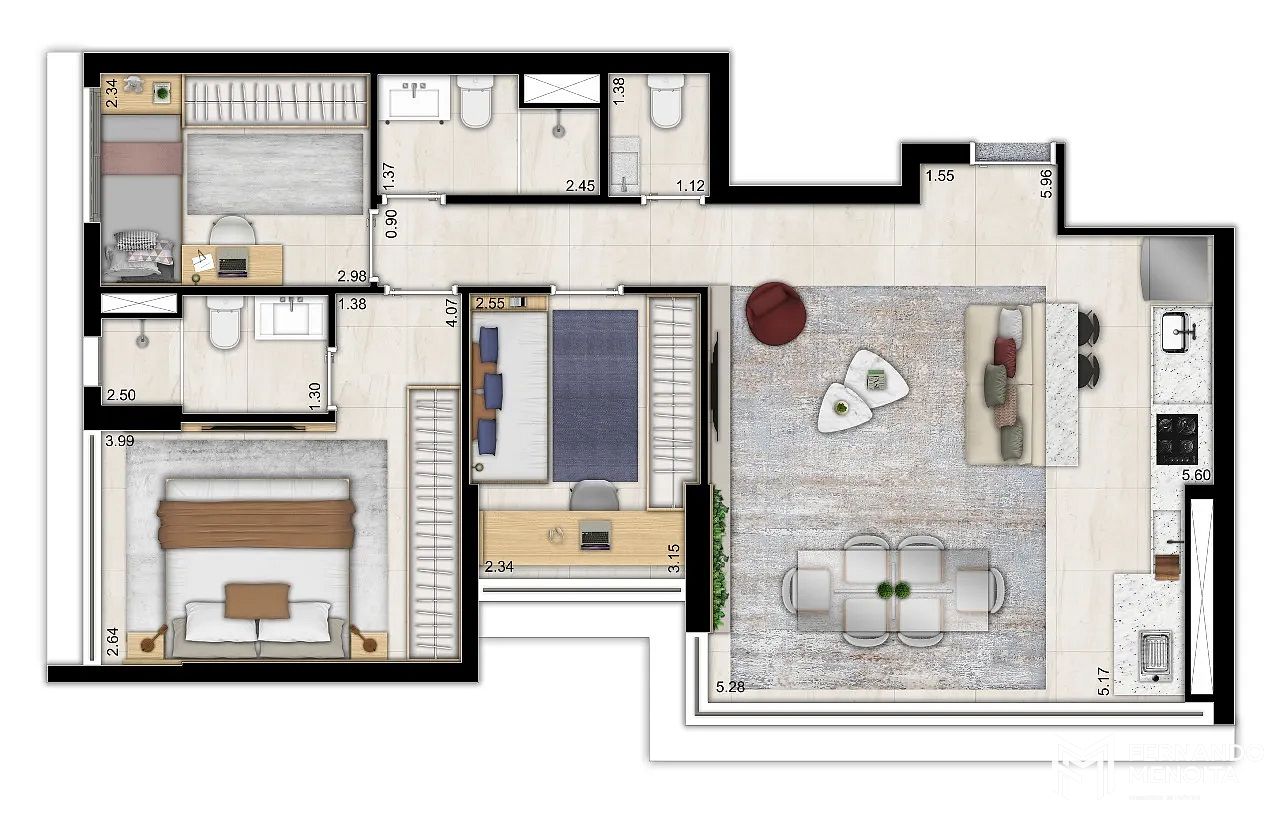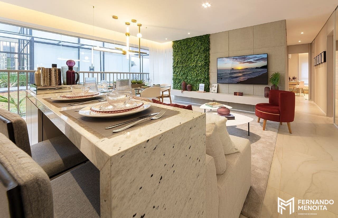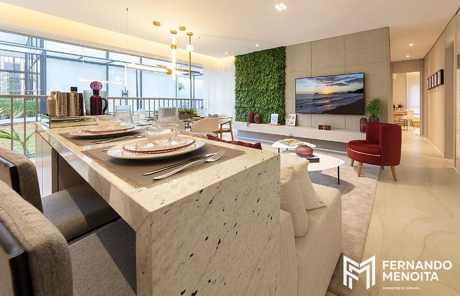 • Apartamentos de 79 m²: 3 dormitórios, sendo 1 suíte, sala de estar e jantar, lavabo, cozinha integrada e terraço social/serviço