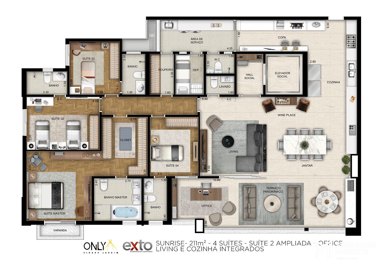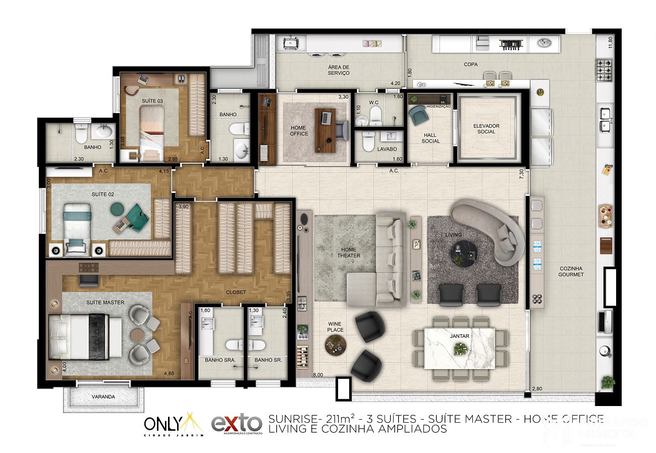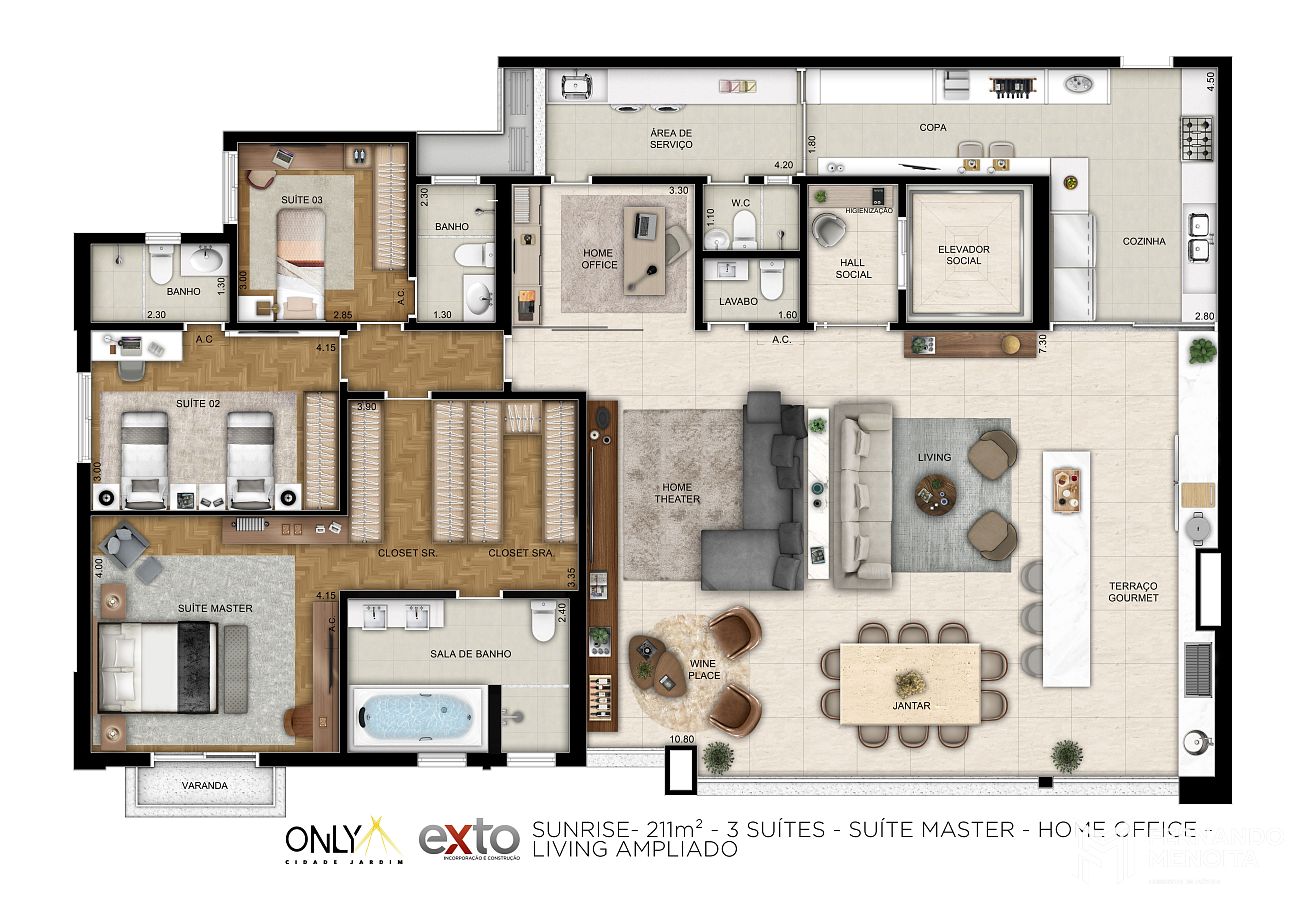 • 211 m² – Sunrise – 3 suítes – suíte master + home office + living ampliado