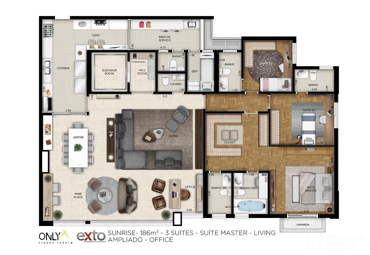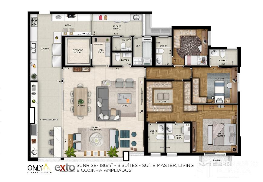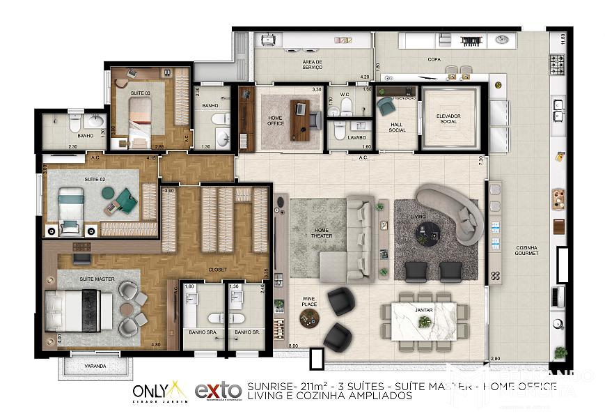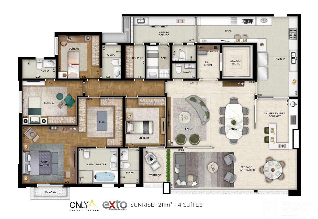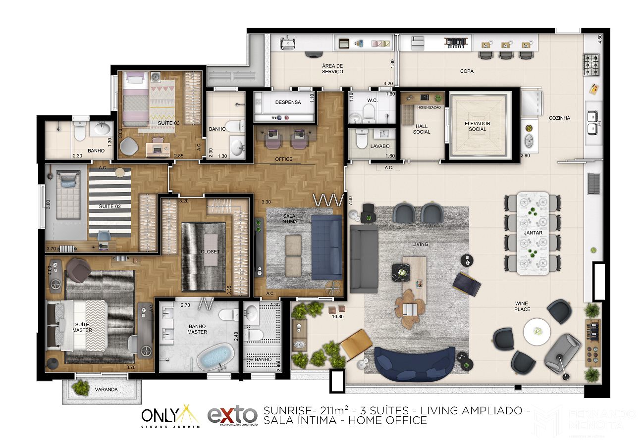 • 211 m² – Sunrise – 3 suítes – suíte master + home office + living ampliado