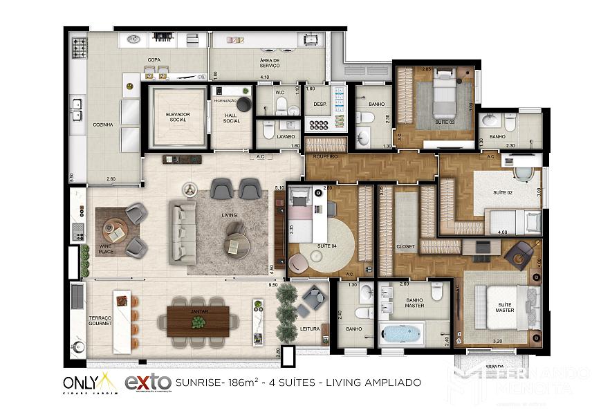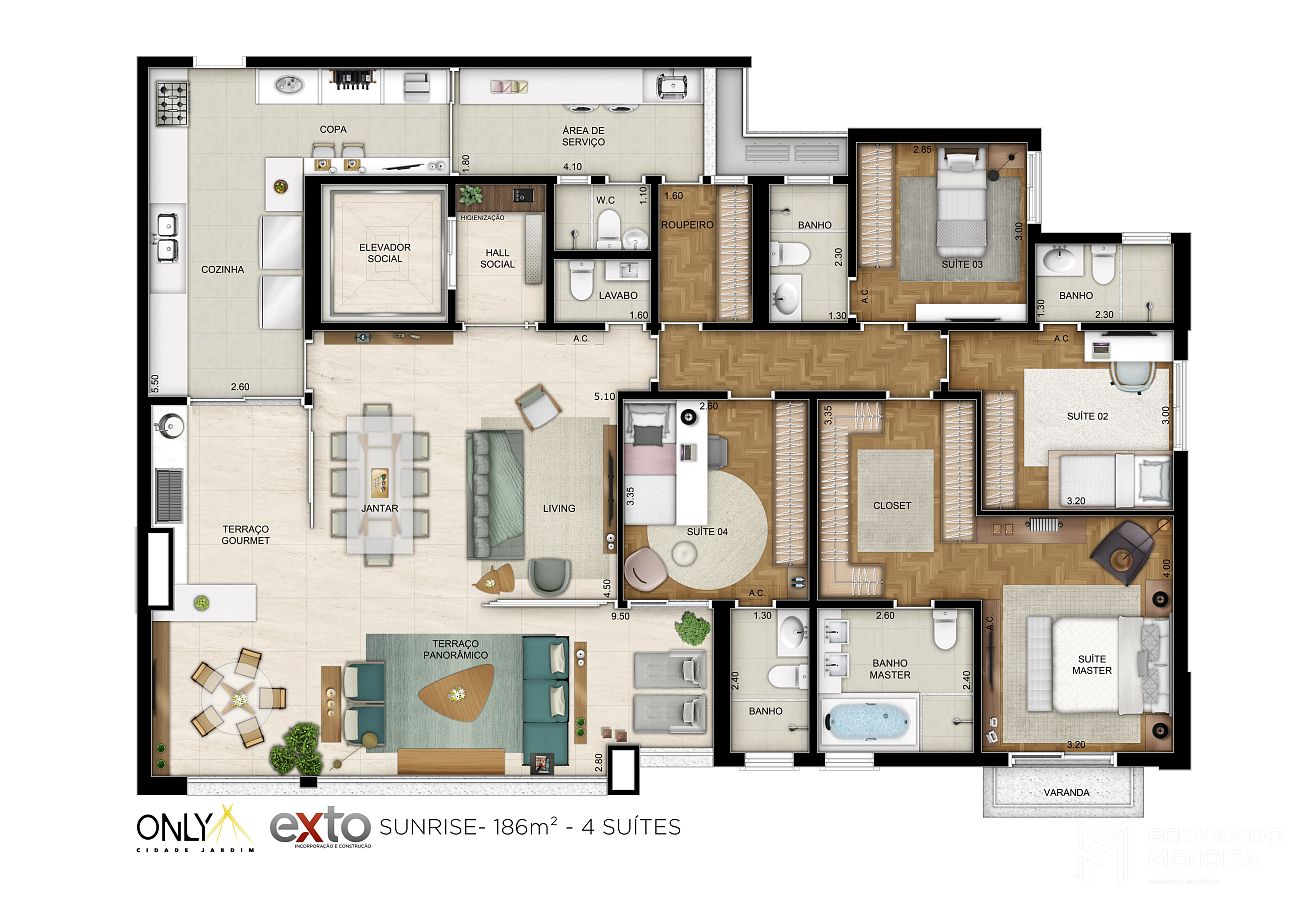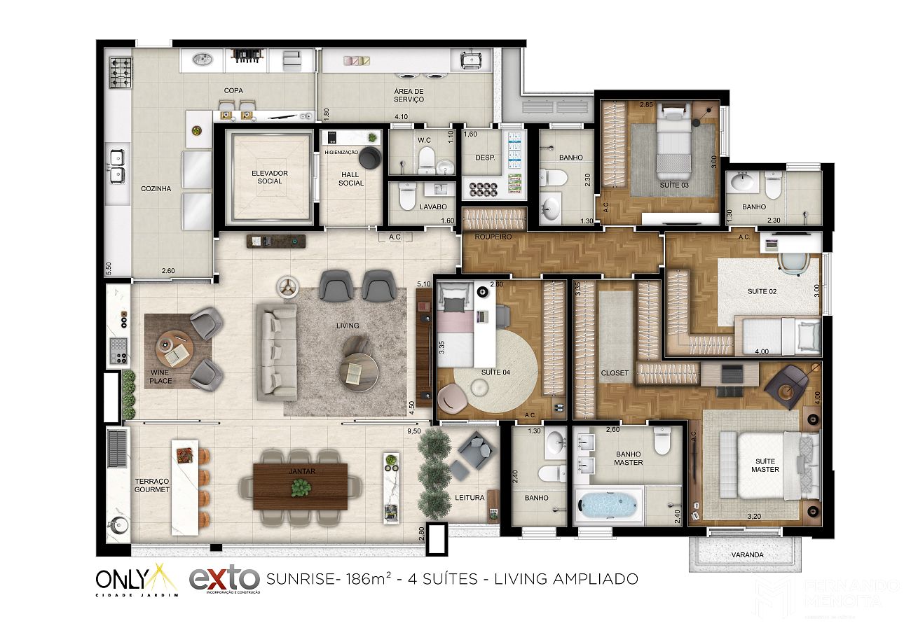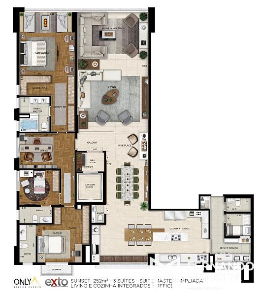 Os apartamentos contam com metragens de 186 m², 211 m², 233 m² e 252 m², com opções de 3 ou 4 suítes, além de versões Sunrise e Sunset, plantas com living ampliado, home office e cozinha gourmet, atendendo aos mais elevados padrões de moradia.