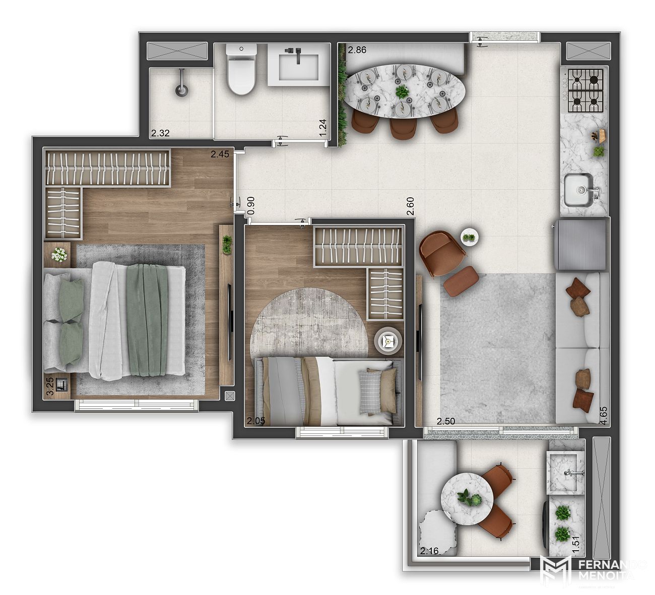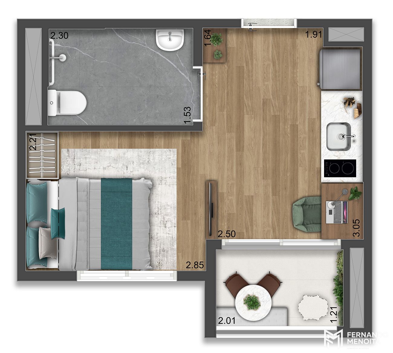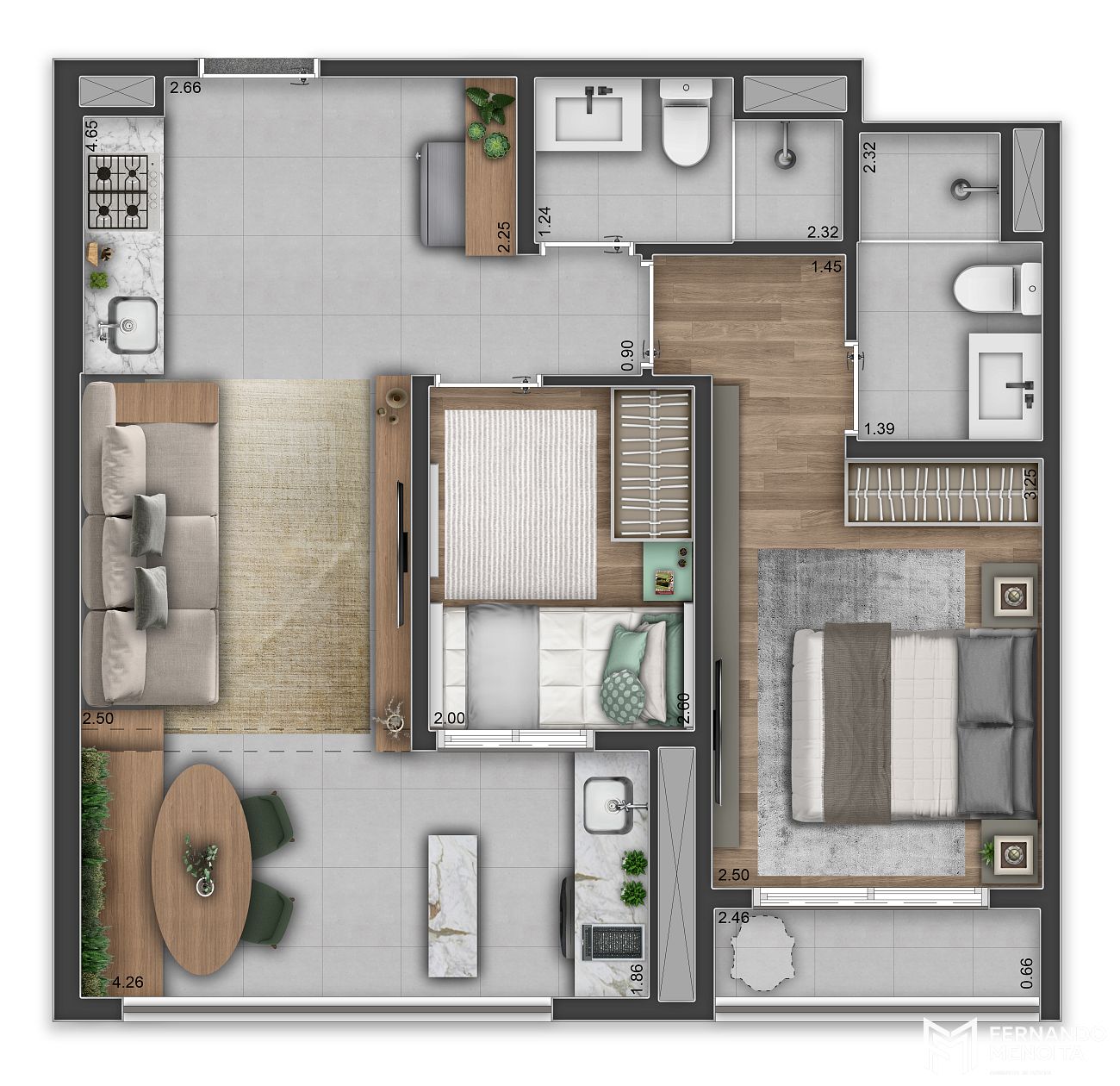 Com apartamentos de 69 m², 53 m² e 40 m², além de studios residenciais e com serviços, o empreendimento atende famílias, primeiro imóvel e investidores, incluindo unidades no sistema HMP (Habitação de Mercado Popular).