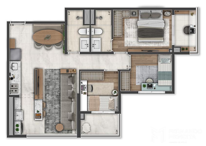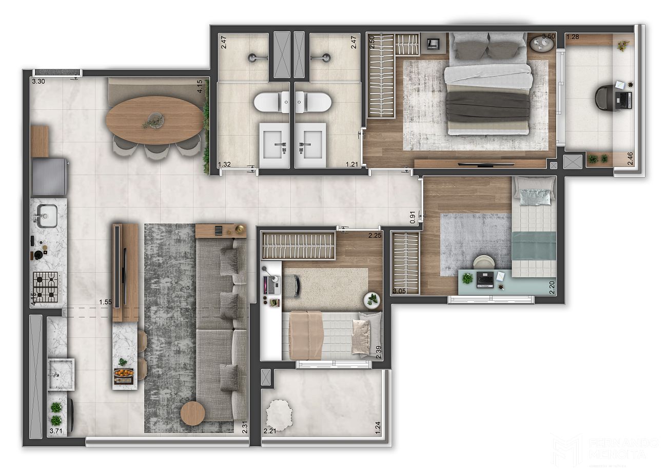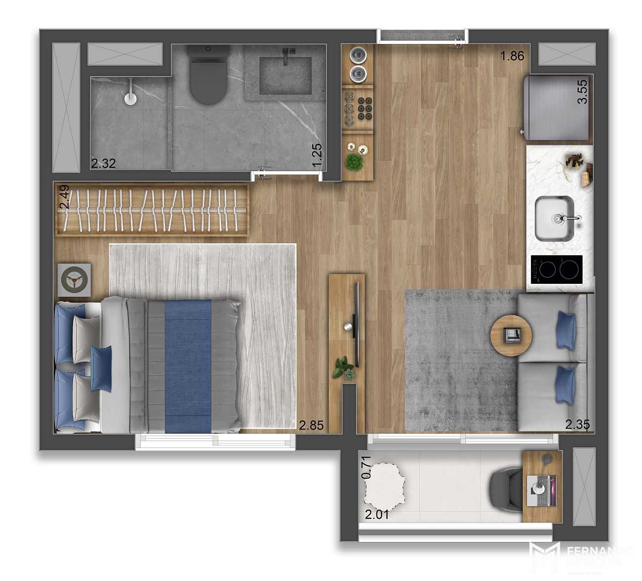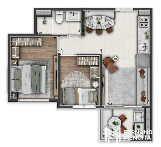 Com apartamentos de 69 m², 53 m² e 40 m², além de studios residenciais e com serviços, o empreendimento atende famílias, primeiro imóvel e investidores, incluindo unidades no sistema HMP (Habitação de Mercado Popular).