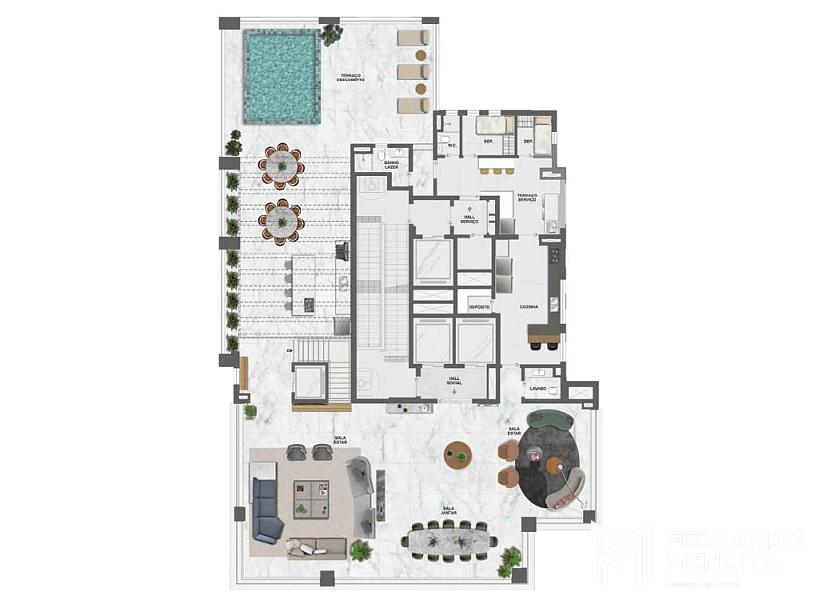 • Hall social e hall de serviço privativos
