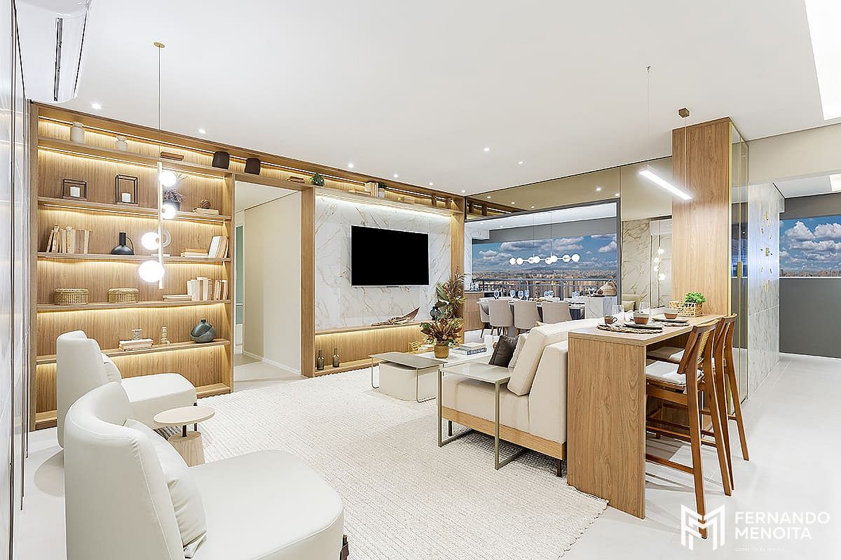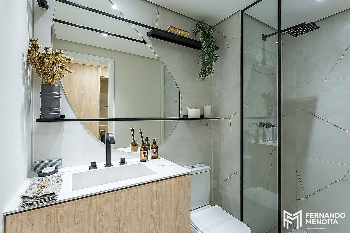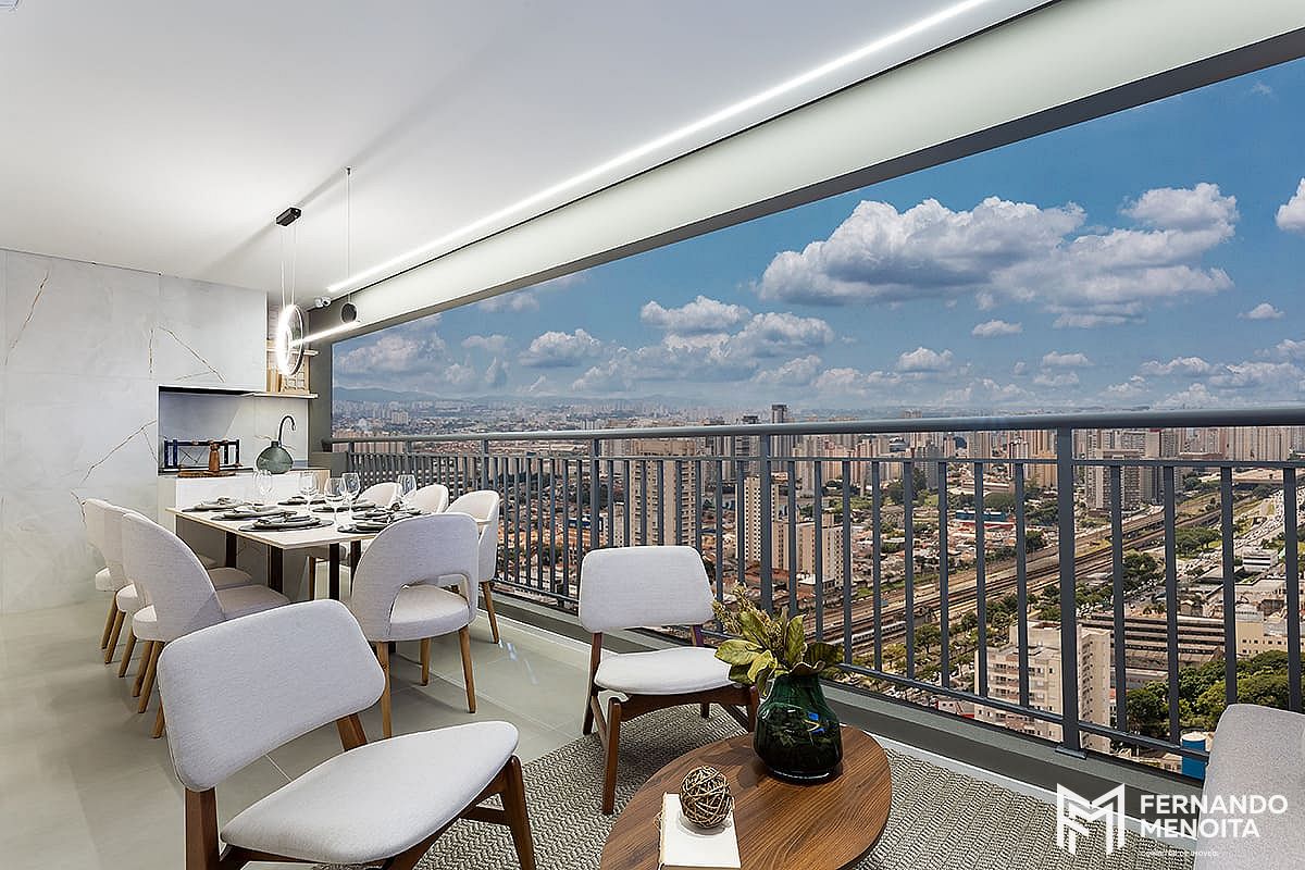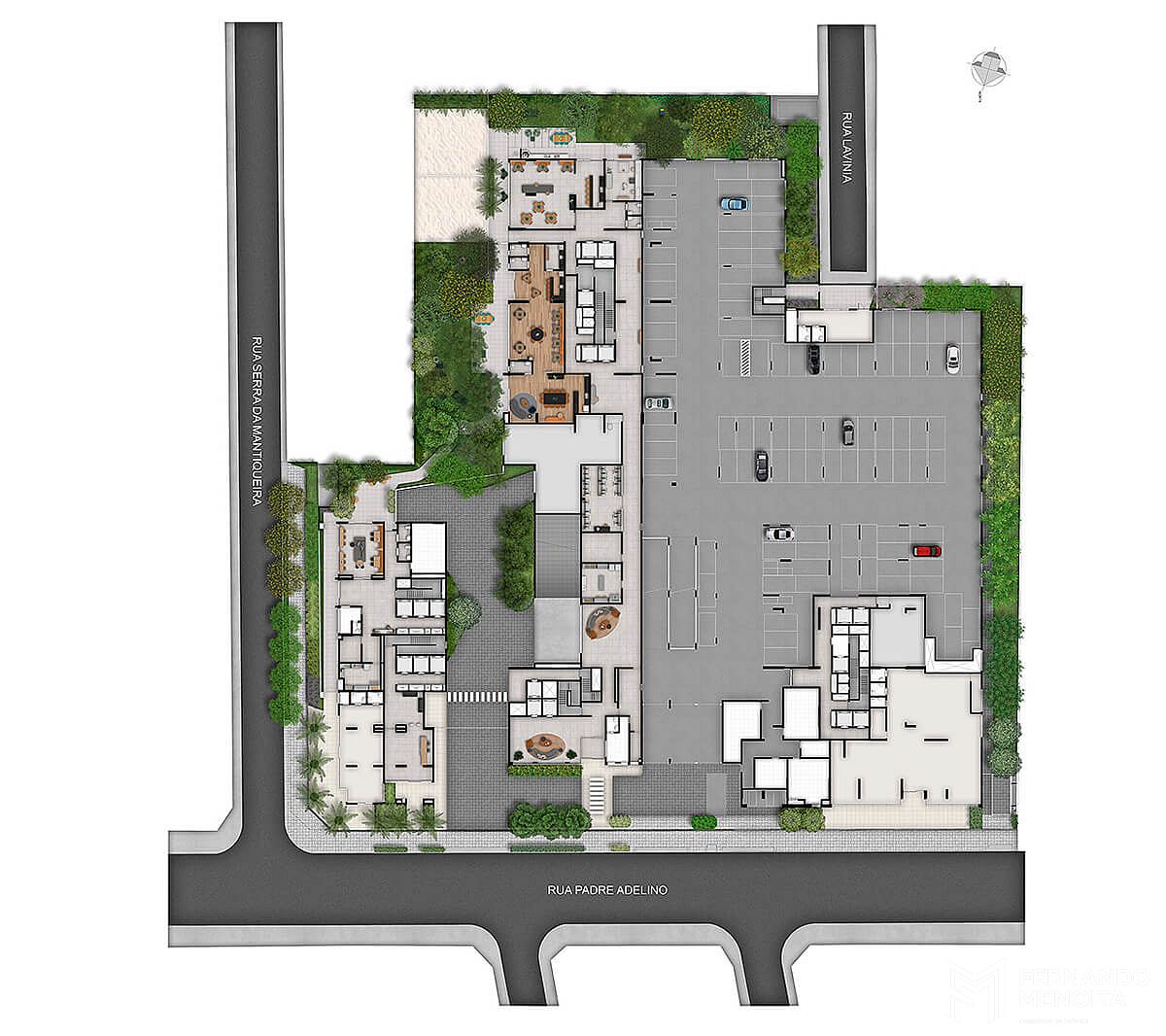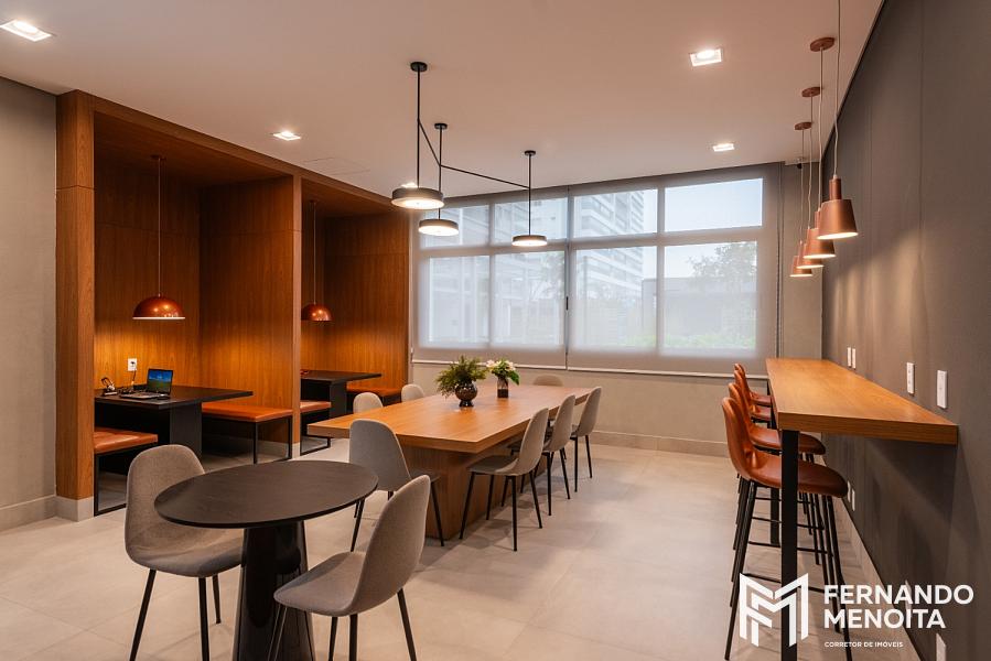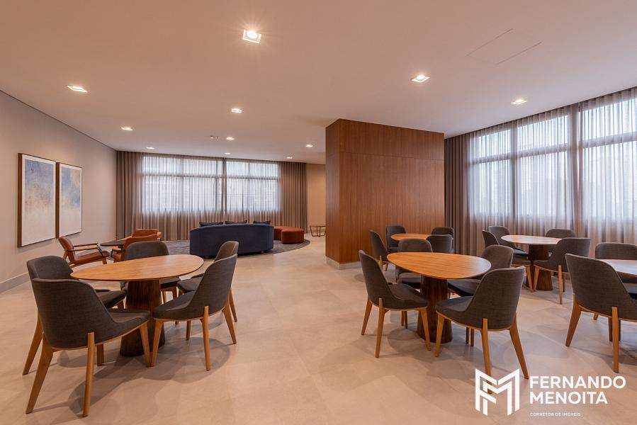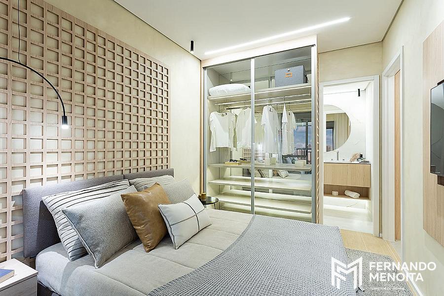 No térreo, o projeto oferece lobby com pé-direito duplo, espaço delivery, minimarket, bicicletário, quadra de beach tennis, pet place e segurança com portaria blindada.