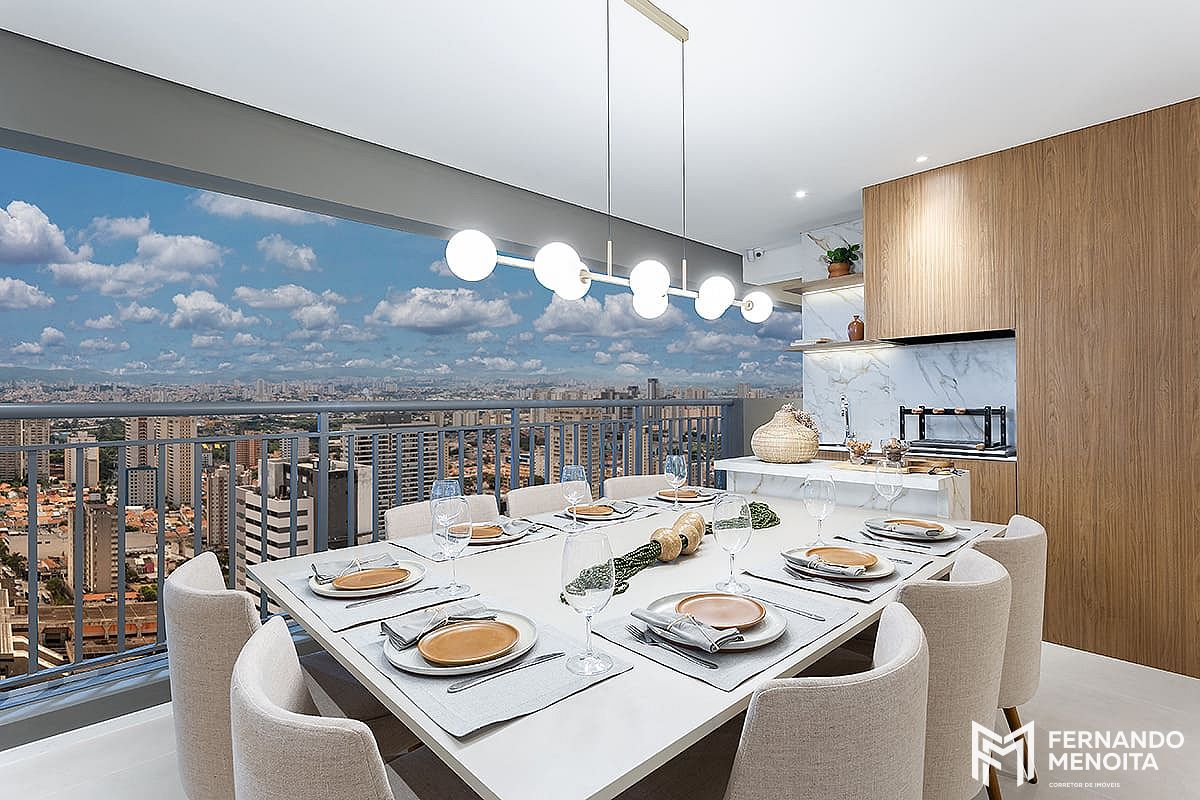 Os apartamentos são entregues com terraço com bancada, cuba e churrasqueira a carvão, infraestrutura para ar-condicionado, persianas de enrolar nas janelas, misturador de água quente, infraestrutura para aquecedor de passagem a gás e ponto USB nos dormitórios.