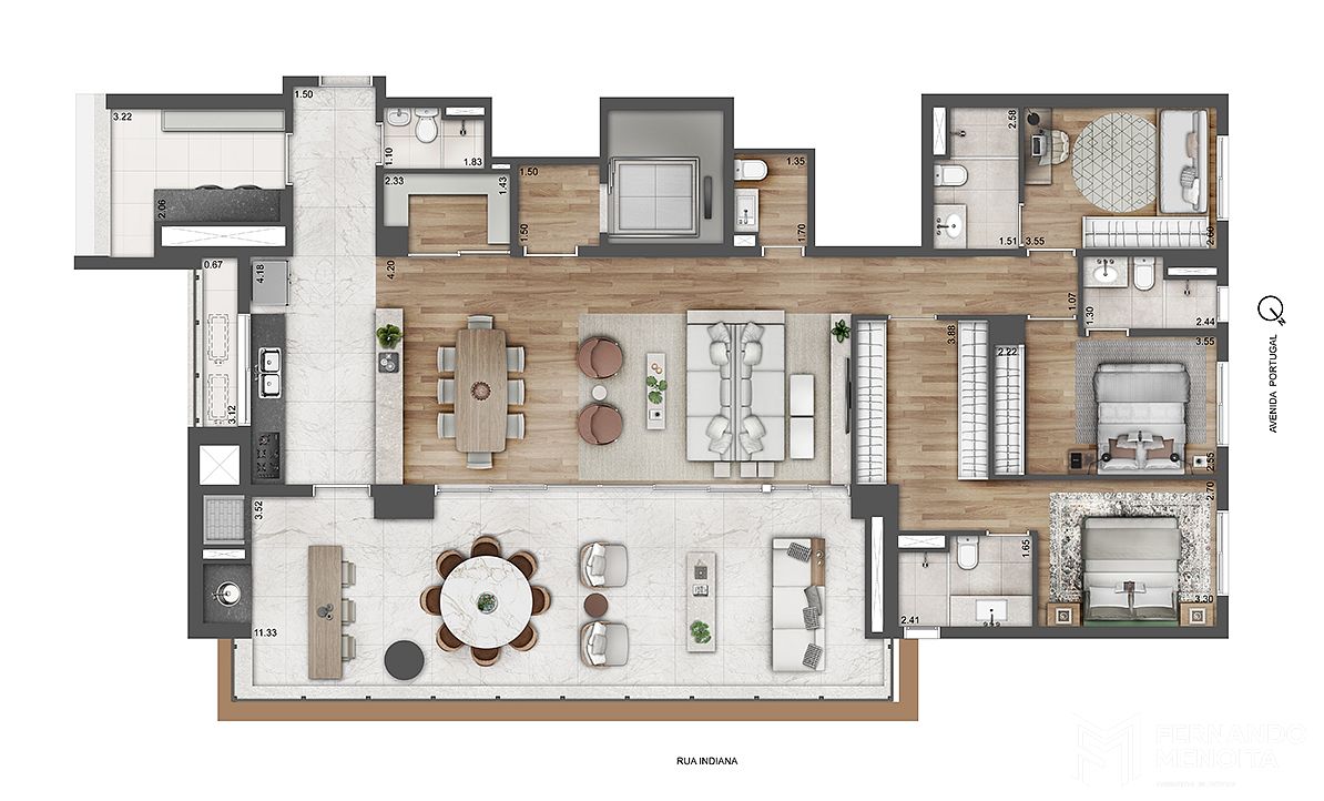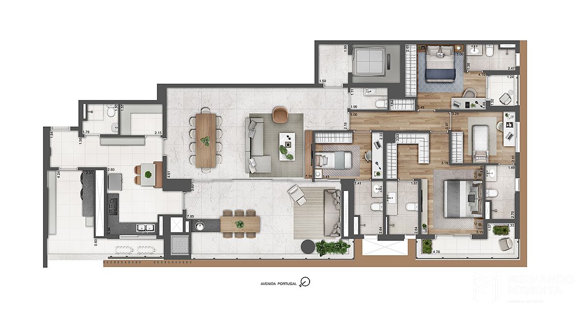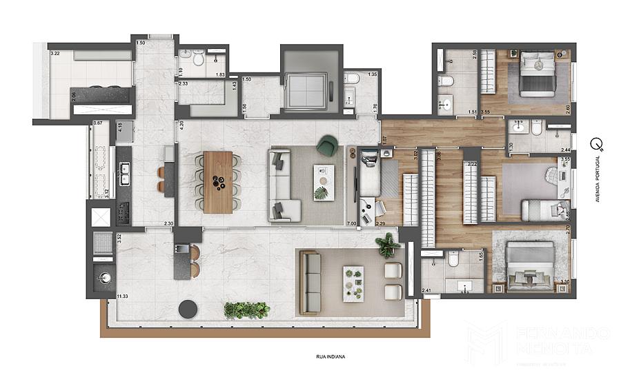 O Portugal 587 oferece unidades amplas de 4 dormitórios e 4 suítes, com metragens de 205,33 m² e 228,04 m², além de configurações com living ampliado. O projeto inclui ainda um conceito inovador de office exclusivo, com metragens a partir de 9,44 m², podendo chegar a aproximadamente 13,25 m², criando um ambiente independente para trabalho, estudo ou uso multifuncional, conectado à unidade residencial, mas preservando a privacidade.