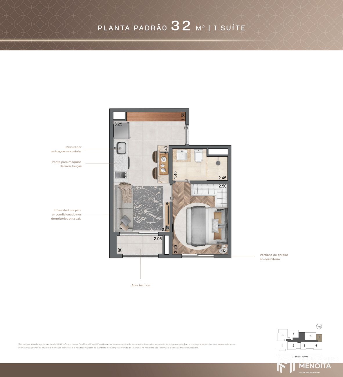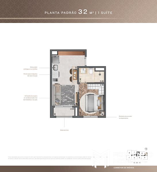 • 32 m² – 1 suíte (final 5 – do 8º ao 22º pavimento)