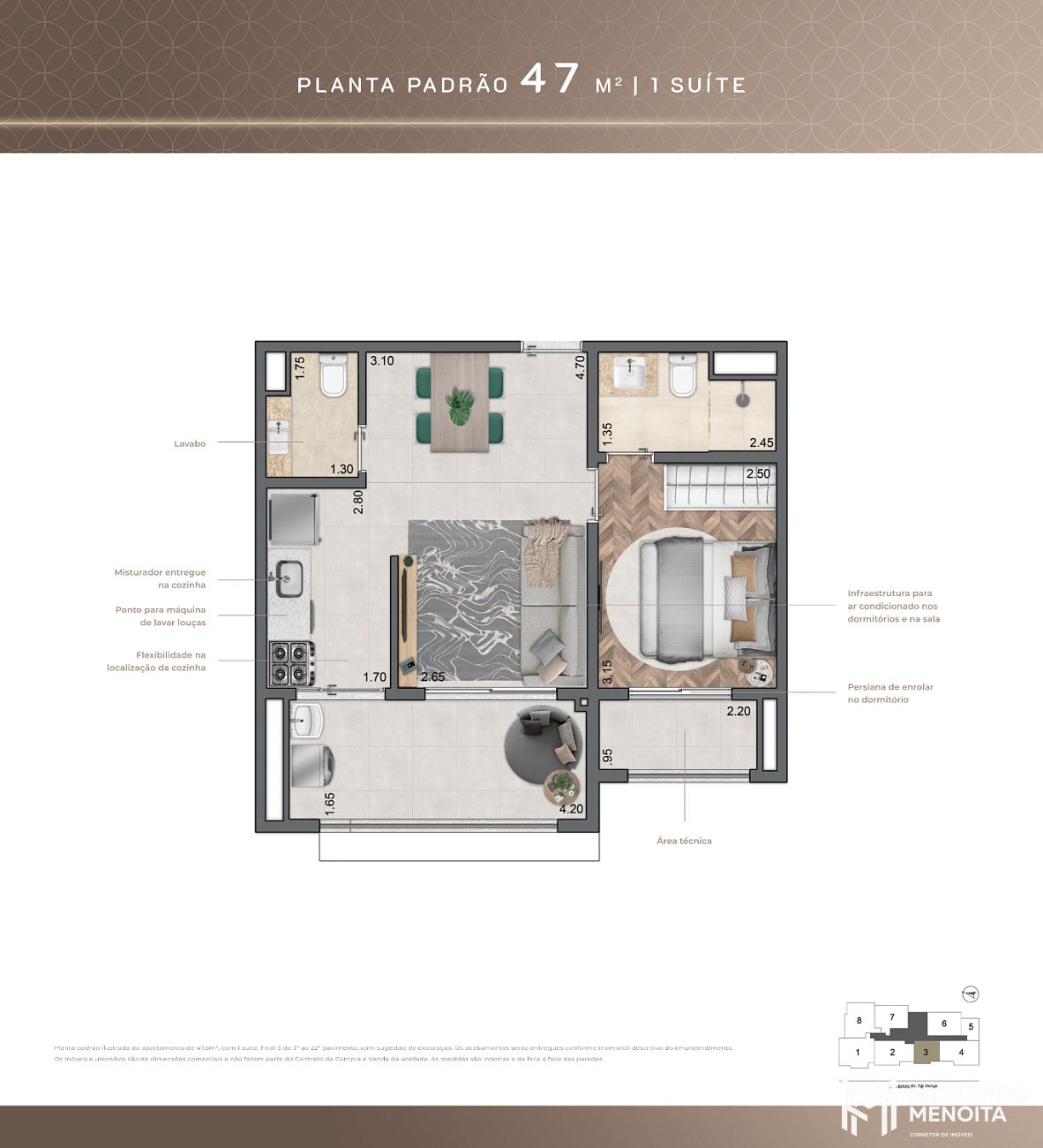 • 47,5 m² – 1 suíte (final 3 – do 3º ao 22º pavimento)