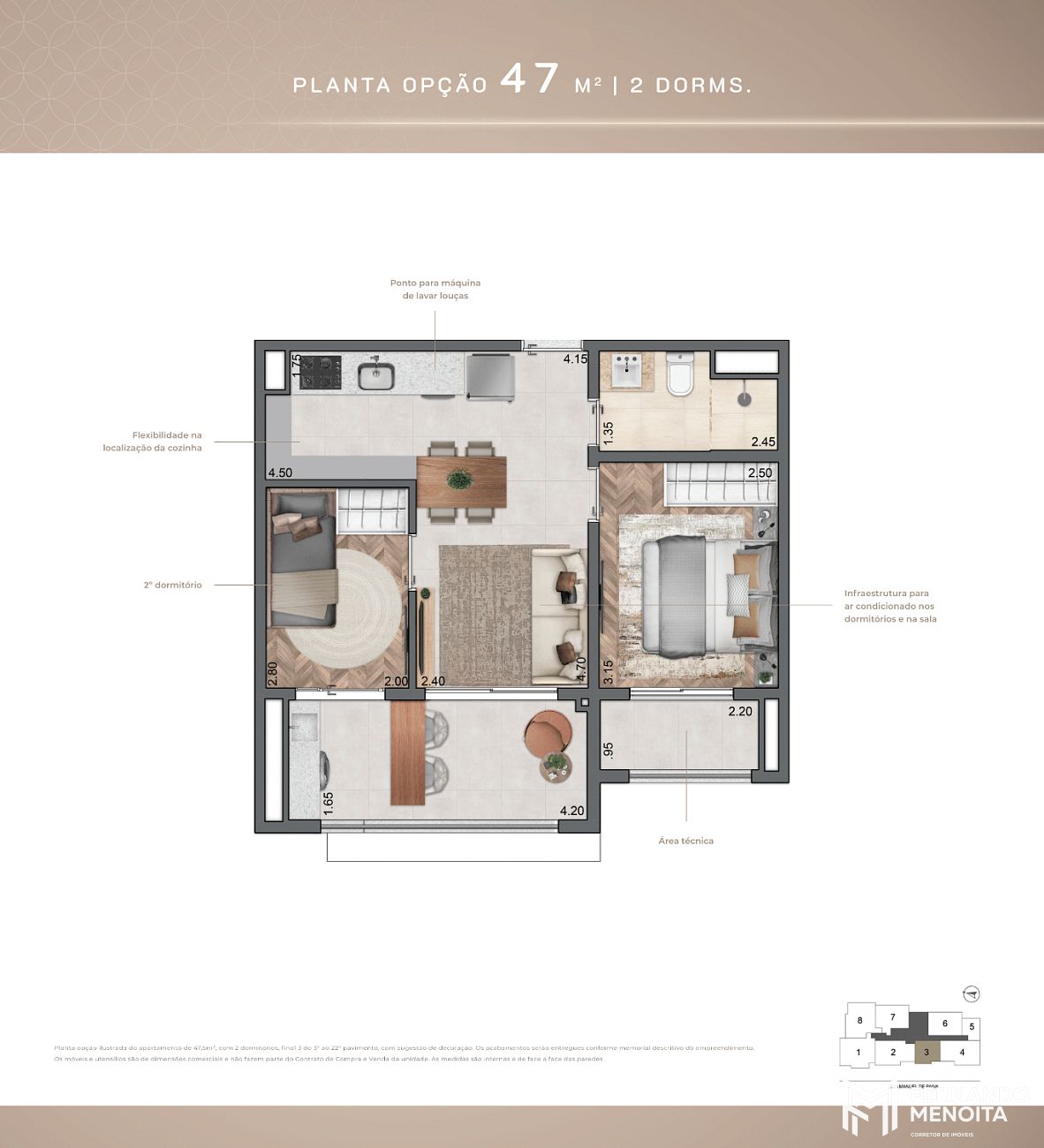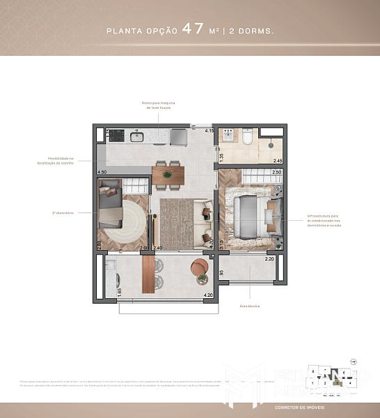 • 47,5 m² – opção 2 dormitórios (final 3)