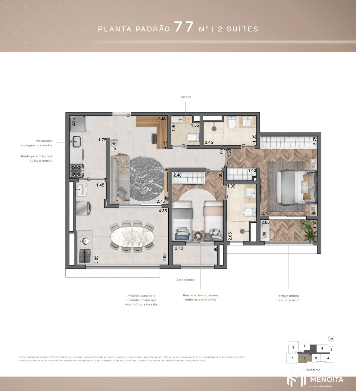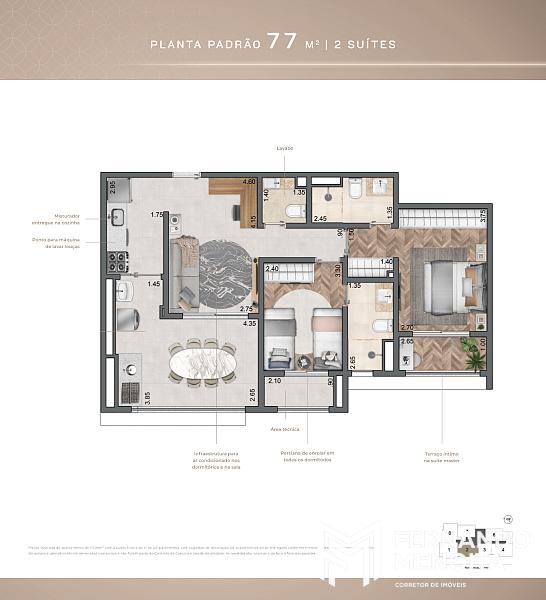 • 77 m² – 2 suítes (final 2 – do 3º ao 23º pavimento)