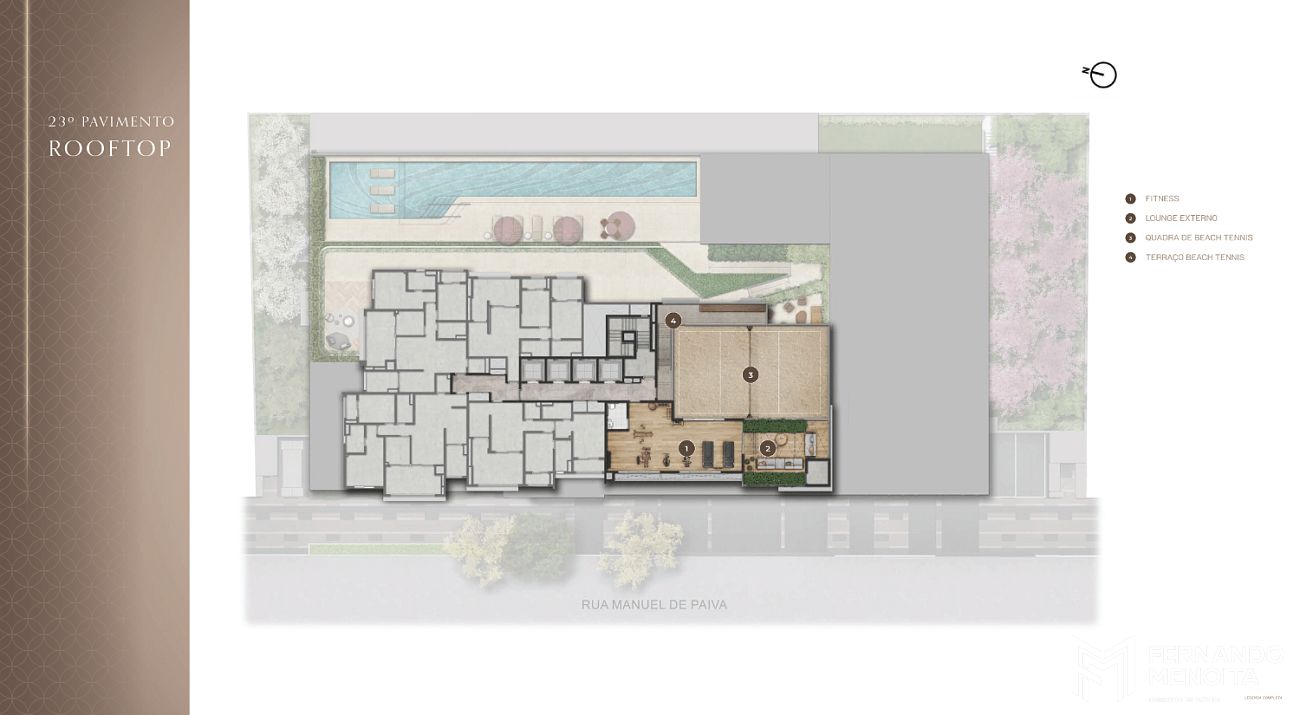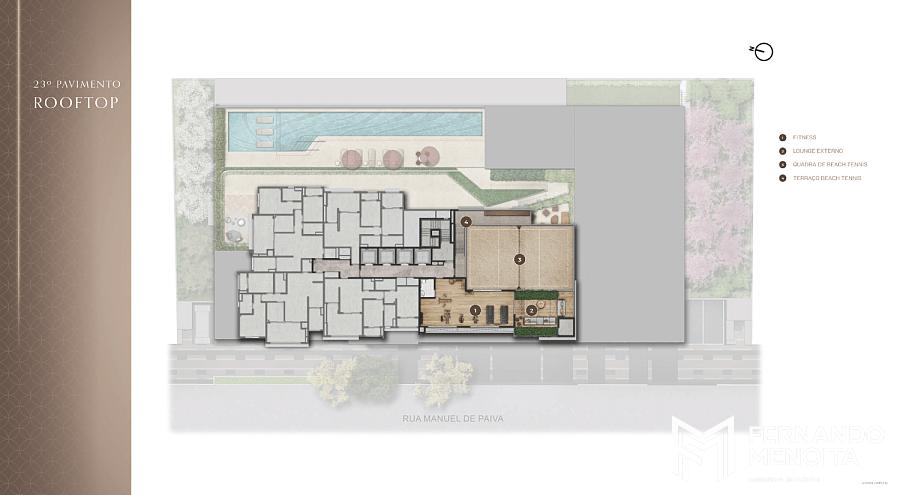 O destaque absoluto fica para o rooftop no 23º pavimento, onde o morador vivencia uma experiência única: fitness com vista aberta para a cidade, lounge externo e até quadra de beach tennis no topo do edifício, algo extremamente raro no mercado imobiliário de São Paulo.